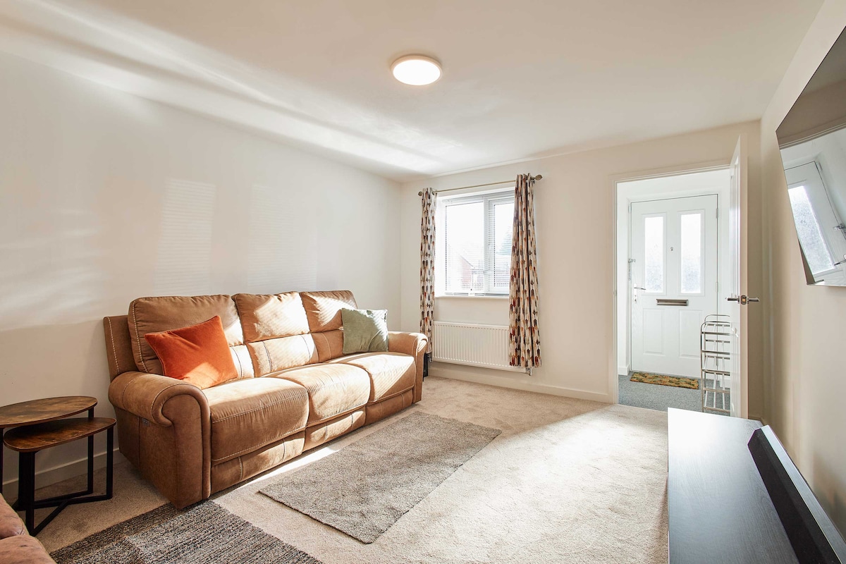 The living room is a comfortable space featuring two large sofas, a flat screen TV with Freeview channels and streaming apps, plus a sound bar. It's the ideal spot for relaxing evenings with your loved ones!