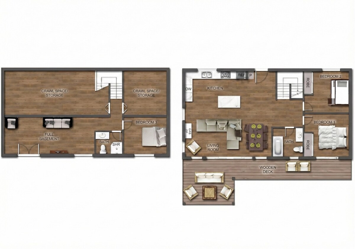INSIDE:As you step inside, you'll be greeted by a modern and stylish interior. The cottage boasts 3 bedrooms and 2 bathrooms, ensuring everyone has their own space to unwind. Oh, and did we mention the two separate living areas? Each one is equipped with its own Smart TV and plush couches, making it a dreamy spot for cozy movie nights.