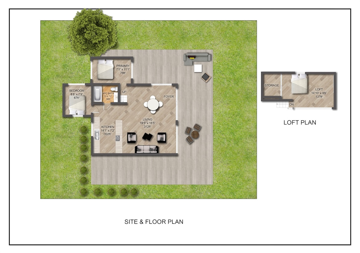 In the dining room, a round table for six invites everyone to sit down and share a meal, whether it’s game night or a candlelit dinner. And for a touch of sophistication, there’s a luxurious drink cart for all your cocktail-making needs. Shake up a creative cocktail, pour a glass of wine, or make something new!