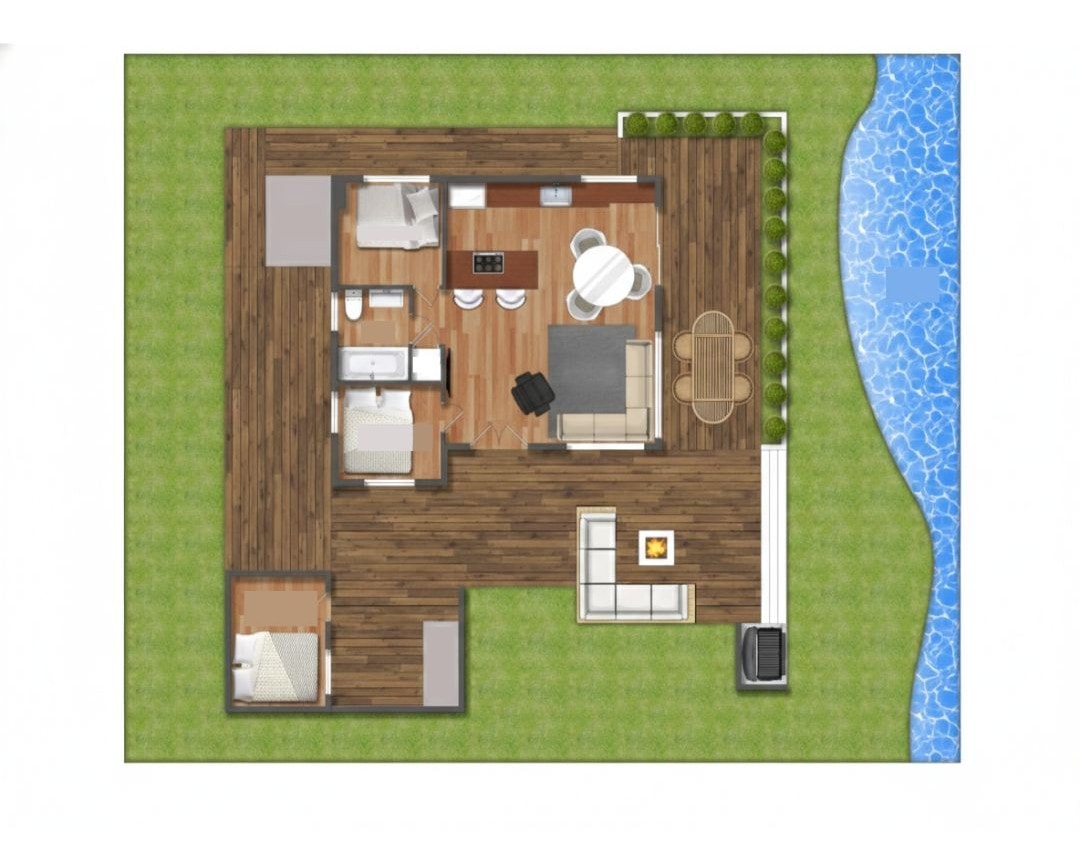 Your lakeside experience continues with everything you need for laid-back outdoor days. Unwind on the luxe outdoor sectional by the fire table is perfect for winding down, sipping a glass of wine as the sun sets over the water, and catching up with loved ones. For those who love to cook outside, the Weber BBQ is ready for all your grilling adventures. And when hunger strikes, the outdoor dining set is the place to enjoy a leisurely meal surrounded by the sights and sounds of nature. Whether you're playing a friendly game of bocce ball or challenging each other to a few rounds of life-size Connect 4, there’s plenty of space for everyone to enjoy. Then gather around the smokeless fire pit for stargazing, ghost stories and s’mores.