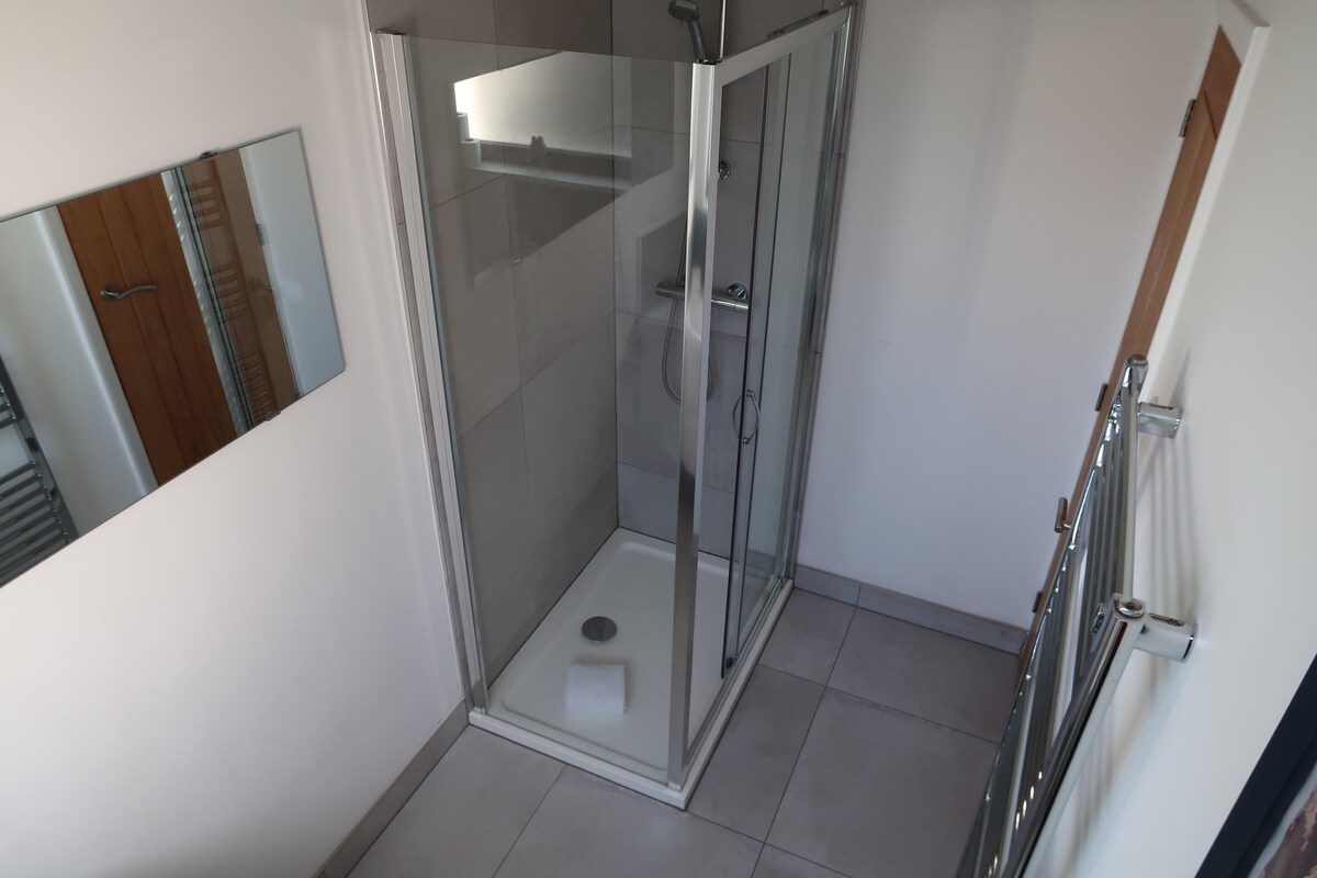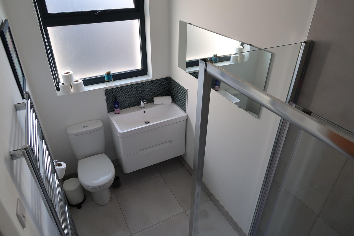 - The bathroom on the ground floor has a shower, sink and toilet.