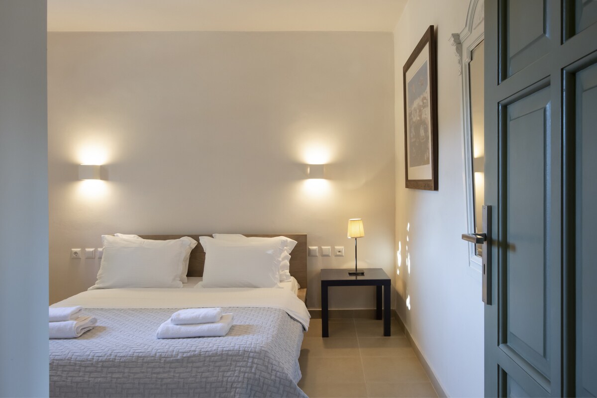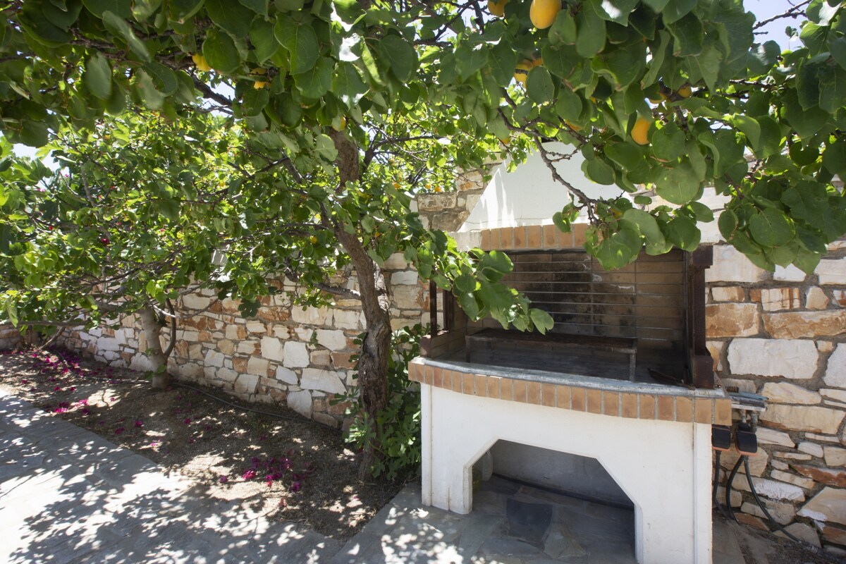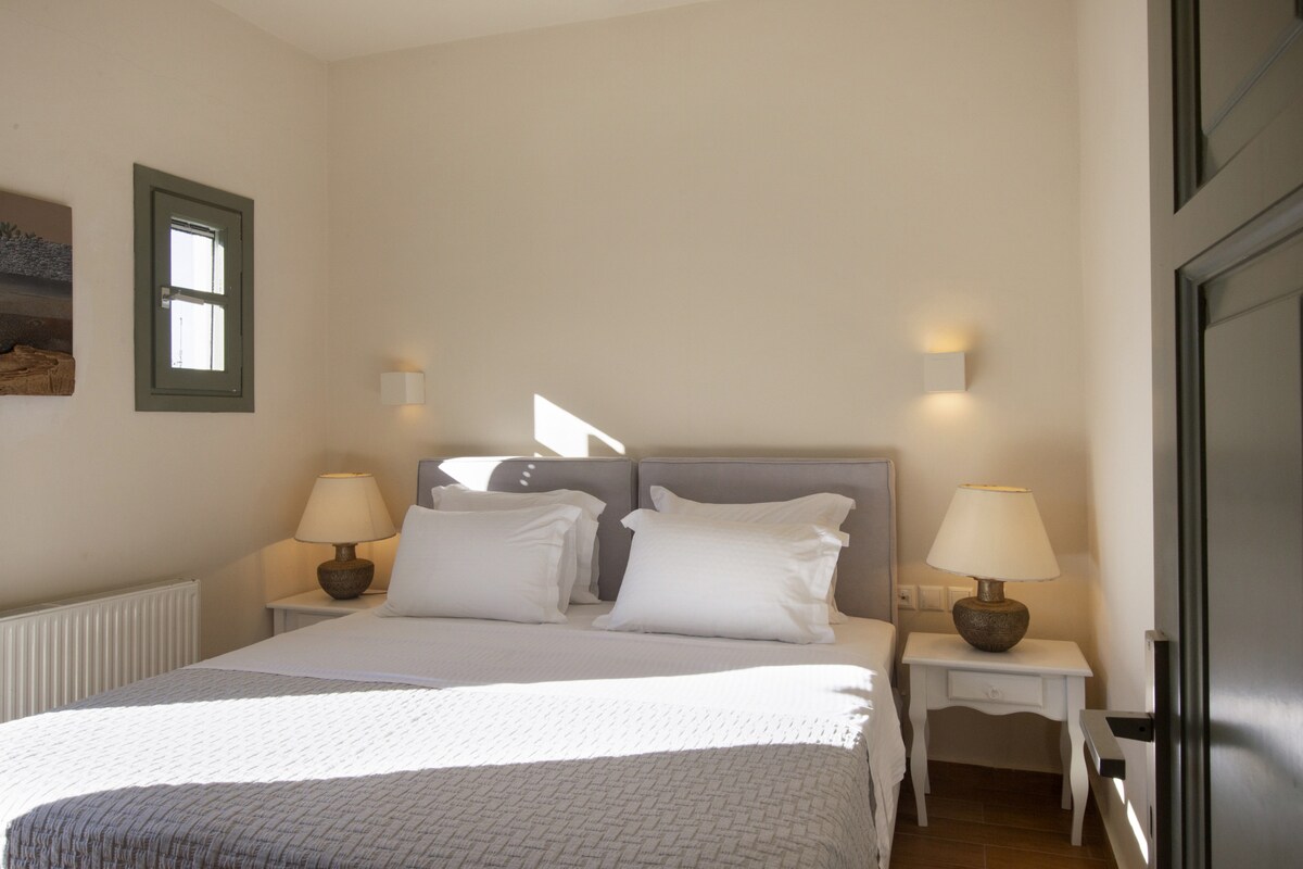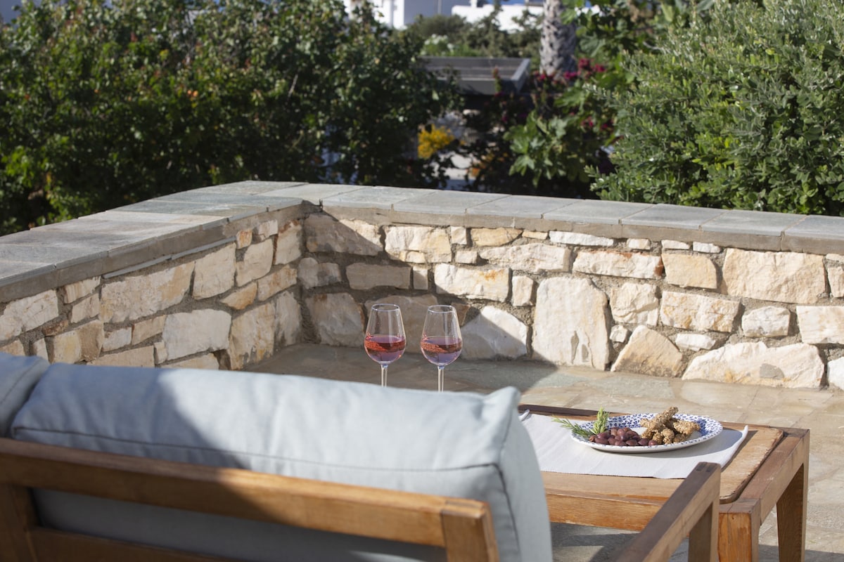 Erato is the quintessential upmarket holiday villa. A beautiful family residence with pool, stunning sea views and a large garden, it has plenty of shaded space outdoors for everyone to wine and dine al fresco. Two gorgeous sandy beaches are just a few steps away and the house can host up to 8 guests very comfortably. For essentials and a bite to eat you can walk to the fishing village of Ambelas, while picturesque Naousa town with its bars, restaurants and shops is a just short drive away. White with green shutters, the villa is modern but has been built with respect to the local minimal Cycladic architecture, using mostly natural, locally sourced materials. You will have exclusive use of its large garden full of trees and aromatic plants. The residence’s large shaded terrace has a private pool facing the sea and a built double bed where you will be able to relax day and night and take in the stunning sea and Paros views or have a bite to eat and something to drink during the gentle summer nights. There is also a large Bbq that our residents love to use to cook with herbs picked from our garden. If you are there during July and August, don’t forget to pick some of your figs, they are absolutely delicious. Inside the house has been decorated with comfort and style in mind. There is a large living, dining and kitchen area with a functioning fireplace. The kitchen is modern and fully-equipped with everything you may need. The bedrooms are very spacious and look out onto the garden and the sea. All four have double beds. One of our bathrooms has a large bath tub and all come with modern showers. You will have exclusive access to the villa and its private garden. We will not be on the premises but we will often be staying nearby and are always available to assist and advise. Ambelas is a charming fishing village, a few minutes’ drive from Naousa town. There is a picturesque port, lovely beaches and plenty of tavernas offering the day’s catch. Some of Paros’ best known beaches, such as Santa Maria and Kolimbithres are just a short drive away. The village also has a riding school, a yoga and meditation centre and shops for necessities. It is a great spot for those wanting to explore Paros’ hillside traditional villages like Lefkes. The villa is located in a residential area within walking distance of Ambelas Even though you can walk to the nearest village, we recommend that you hire a car to enjoy your stay as there is no local bus stop near our home. Villa Erato's sister homes are also available: Villa Aphrodite Villa Alkyoni Villa Anemos Villa KirkiGuest access