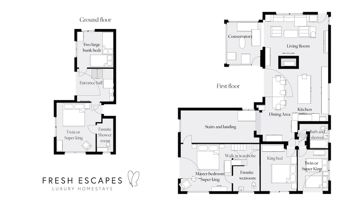 The driveway comfortably fits five cars. There are steps leading up to the front door. Once inside, there are two downstairs bedrooms (one en suite with a glass shower and freestanding stone basin) with a large super king bed and a built-in wardrobe and the other with two fabric large bunk beds.