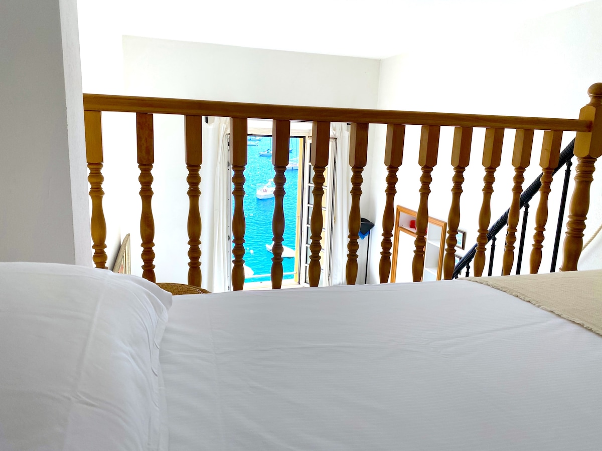 The mezzanine sleeping area: a double bed, two bedside tables, a fan, and wardrobe space.