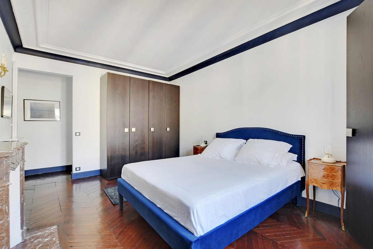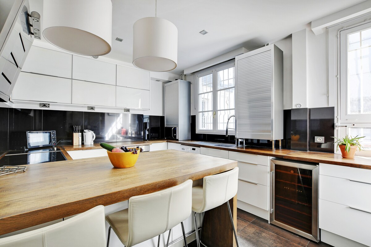 This quintessential Parisian apartment has been lovingly restored and renovated by the owners in 2022. They took full advantage of the classic features and enhanced them with a touch of modern accents. You even have the family's vintage china that was brought to the flat. All photos adorning the walls were taken by the owners.Upon entering the apartment, immediately in front of you is a grand living area that fills with sunlight in the afternoons. It offers a comfortable sitting area along with a 6-seat dining space. Modern electronics are discretely hidden in the buffet with a connected television and a Sonos sound system.
