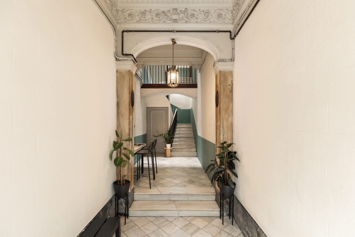 This apartment still features the original characteristics of the building with modern updates. You will find 2 bedrooms and 1 bathroom. The dining/living is located on the back side of the building. Bedrooms are in the front and back of the apartment.Entering this apartment, you will find that there is one bedroom/bathroom to the left. This bedroom has a double bed and closet with the bathroom connected to it. On the right, the dining room and kitchen can be seen. There is also a toilet bathroom next to the kitchen. Further into the apartment, you will see the living room with the second bedroom on the right. This bedroom also has a double bed and plenty of storage. At the back of the apartment, there is a gallery room with plenty of windows and natural light.