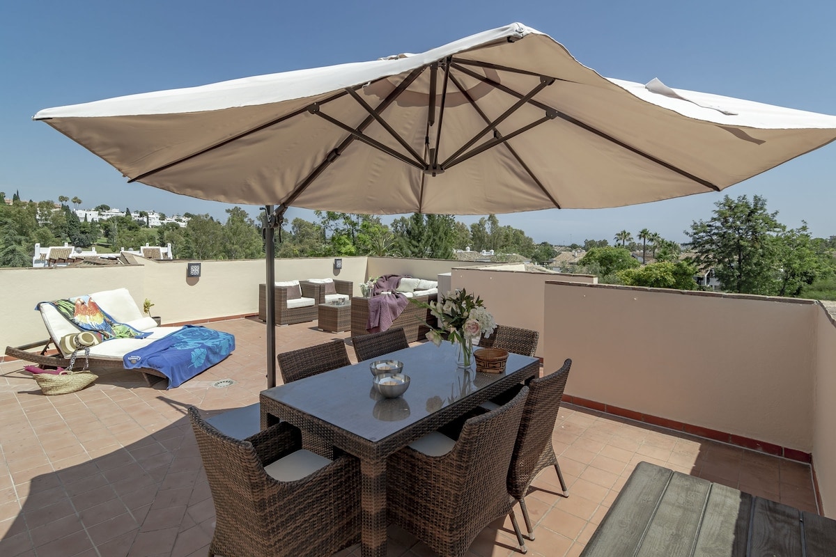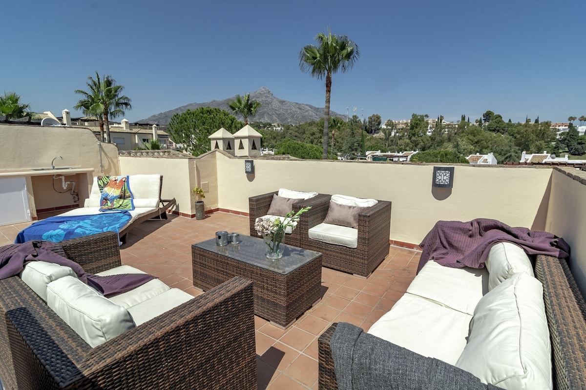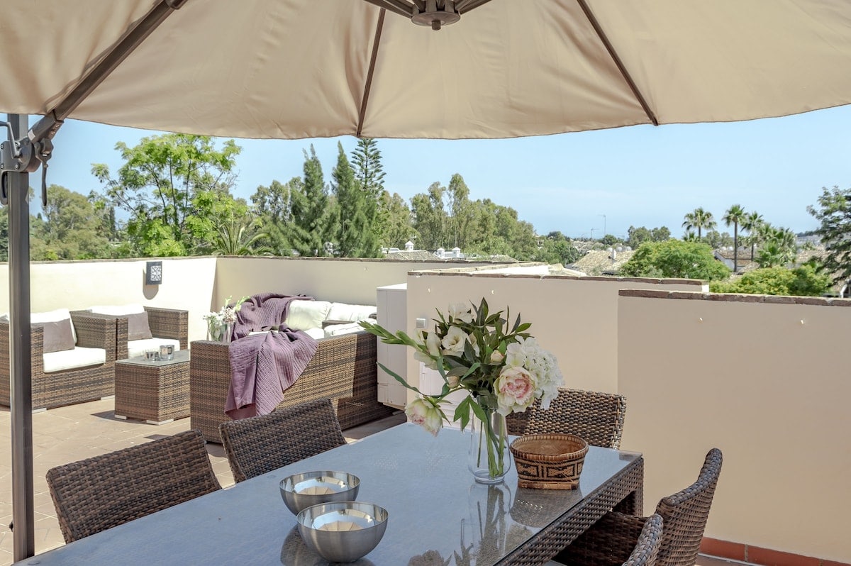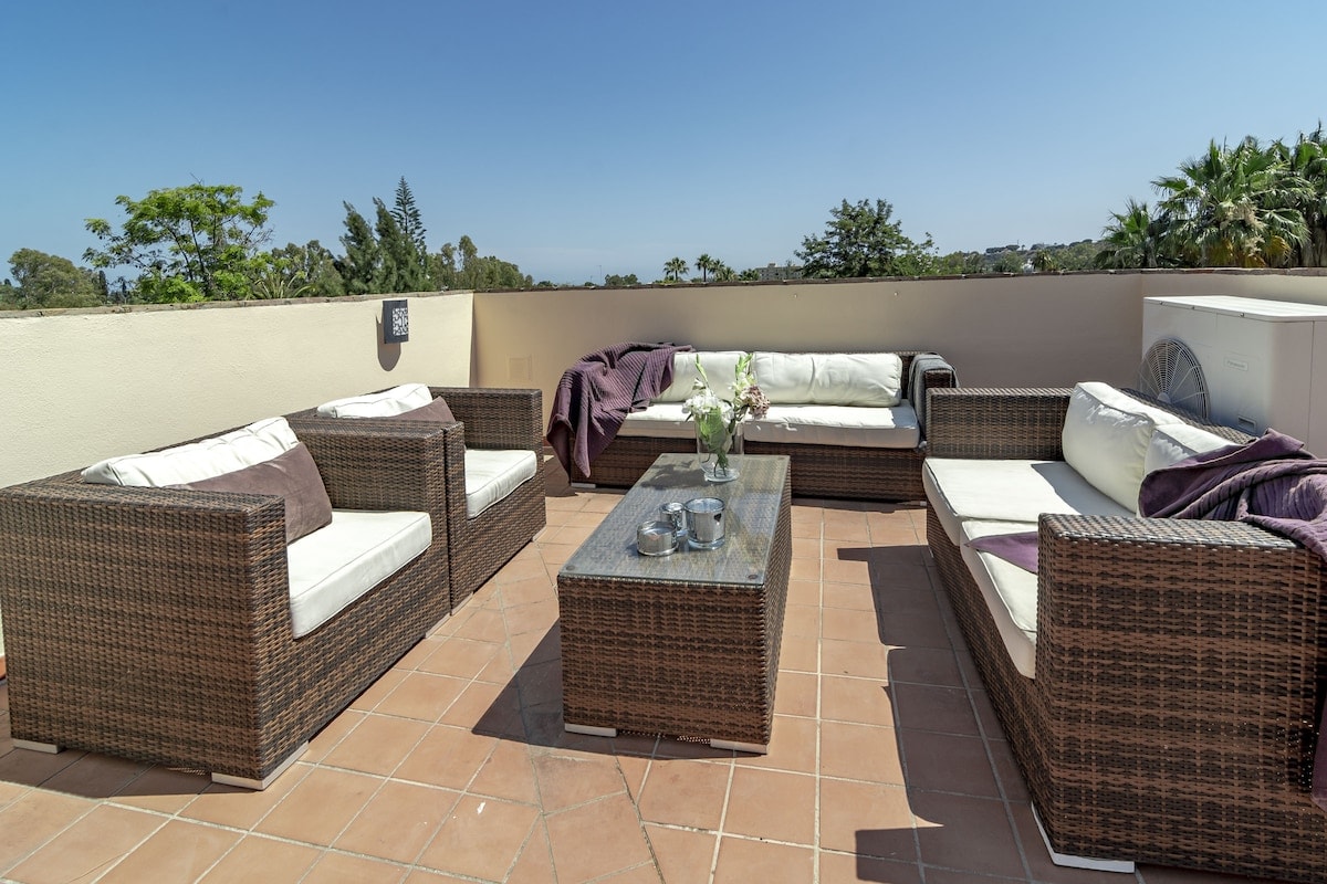 The house is situated in a charming neighborhood in a suburb.This 3 bedroom penthouse apartment in Nueva Andalucia has capacity for