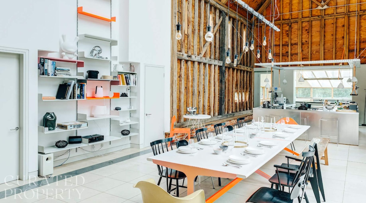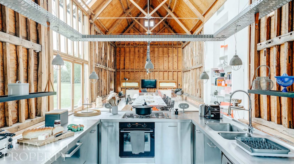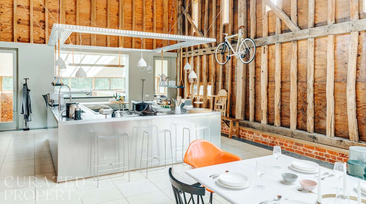 Retaining its traditional beams and brickwork yet featuring a contemporary, stylish interior, this unusual barn conversion offers character in spades. The property takes advantage of the contours of the hill on which it was built, with several sunken garden areas giving outside space to three of the barn’s four floors.Double doors lead from the drive to the entrance area, giving access to a cloakroom, laundry room and storage cupboards. The long sloping corridors open up to stairs leading into the vast open-plan living area with its spacious and well-equipped kitchen. Those who enjoy hosting will be in their element, with the kitchen and dining area catering for up to 14 people.