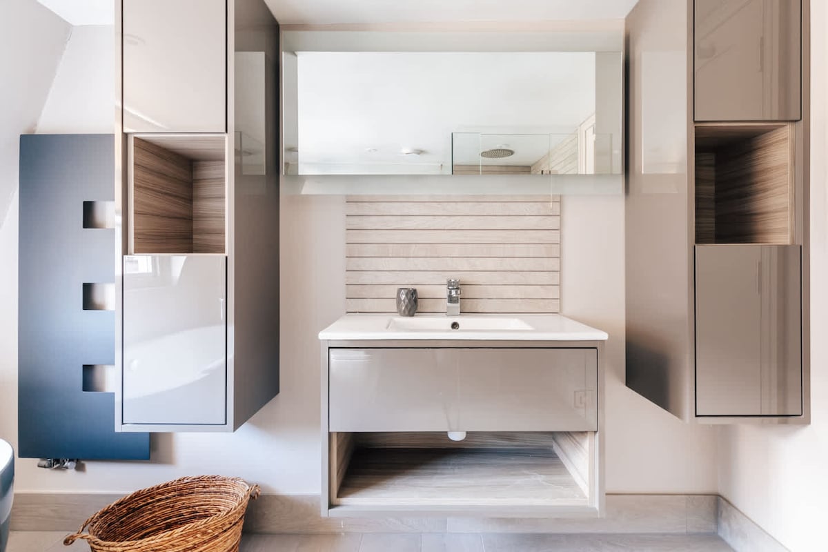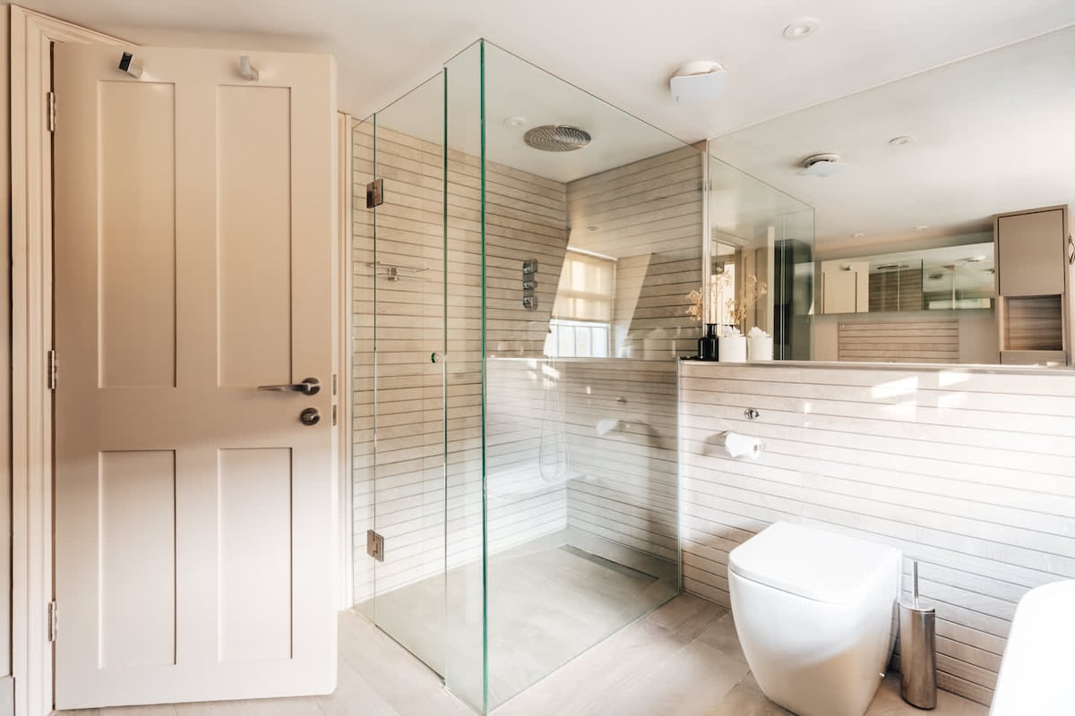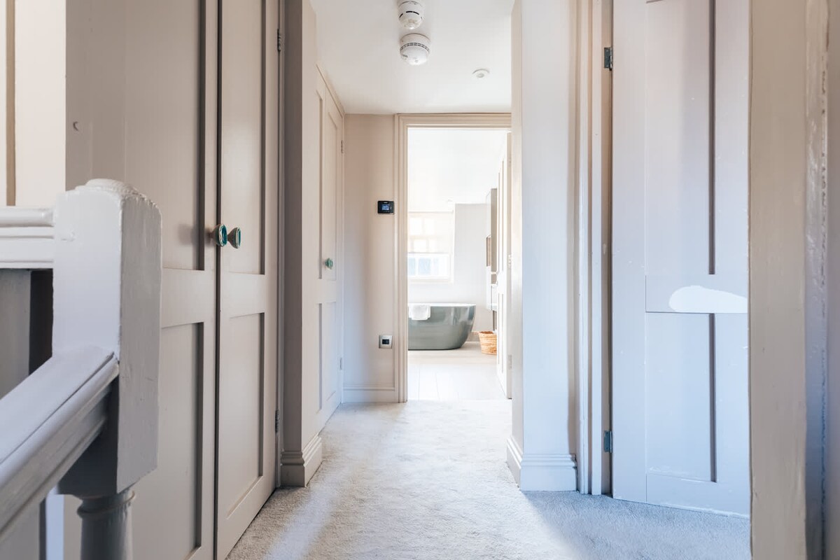 Between the bedrooms is the capacious bathroom, decorated in cool, calm greys and white. A standalone bath sits below the window where you can lie out in total privacy, watching the day go by. There is also a large separate glass-encased shower.