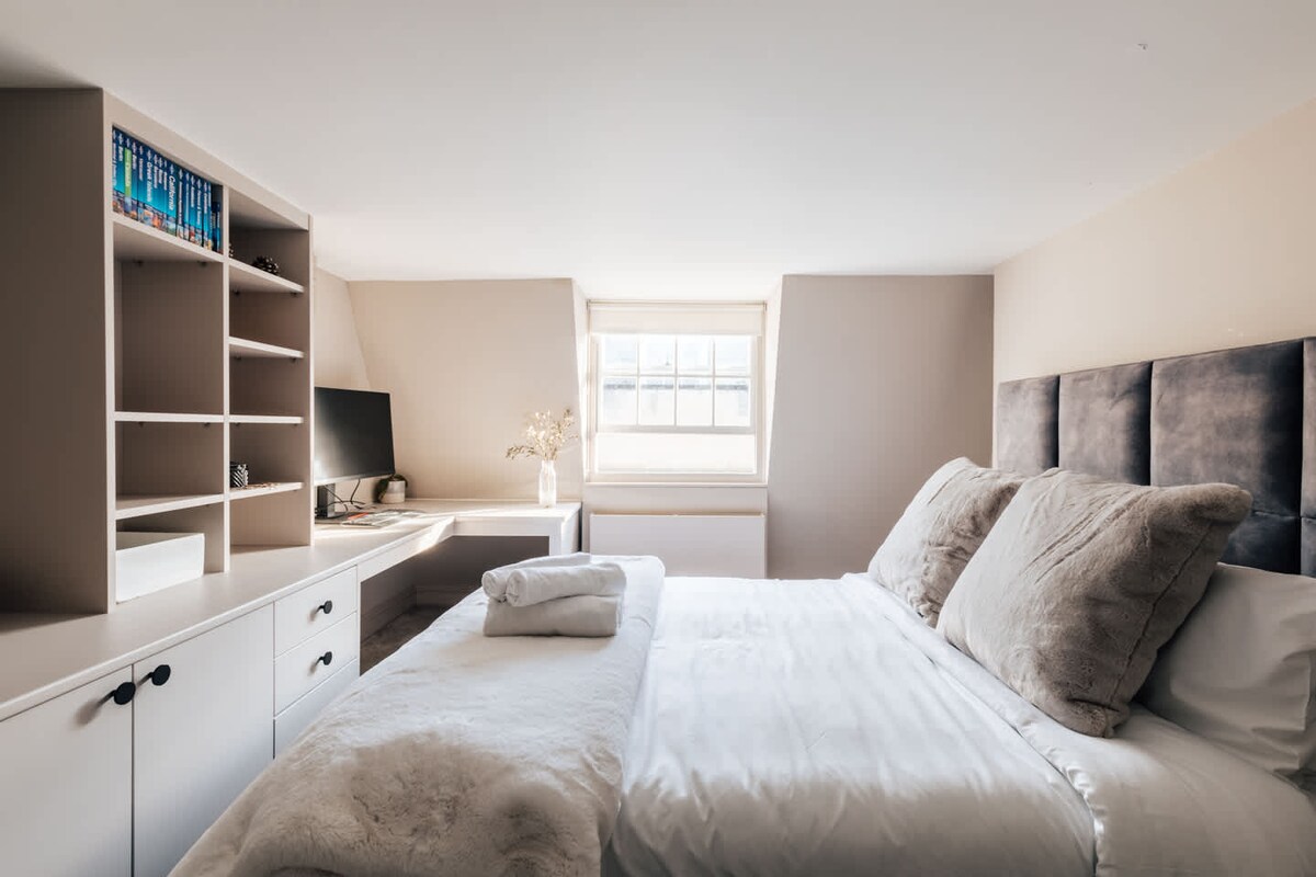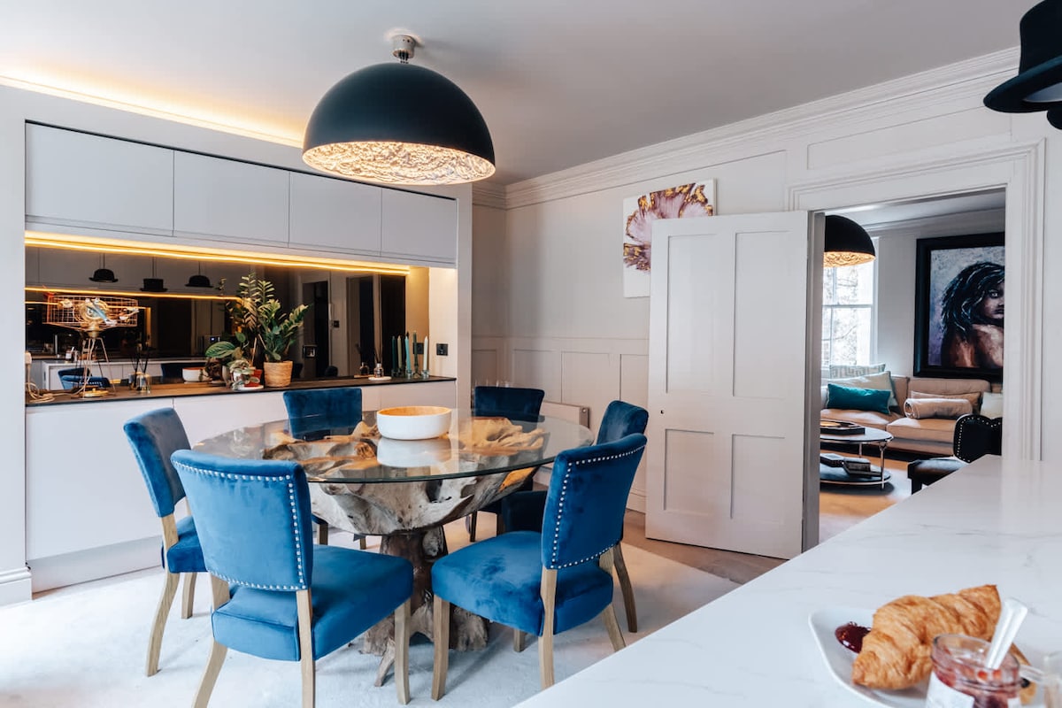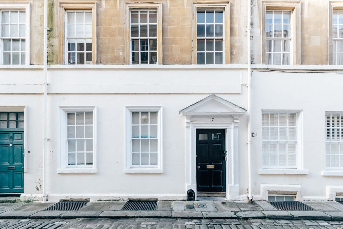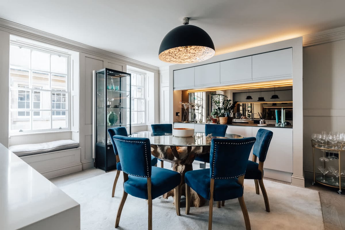 Old Orchard Street is a quiet backwater in the busy city, yet is quintessentially Bath – beautiful architecture, rich in history and some hidden secrets. The unexpectedly large communal courtyard garden behind the property is a reminder that here was once an orchard tended by the Abbey’s Benedictine brethren before being dissolved in 1539. The apartment sits high above with a large open plan kitchen, dining and living area on the 2nd floor and two double bedrooms and a bathroom on the 3rd floor from which there are views to the Abbey’s spires.The apartment is accessed from the ground floor doorway via the main staircase to its own front door. A small hallway opens into the kitchen where tall sash windows let light flood across the polished white marble island and open plan dining space beyond. Comfy cushioned window seats welcome those who would rather read a recipe than attempt one. Under the island unit are three Walter Knoll Lox bar stools, with three hat lights overhead by British designer, Jake Phipps. The galley-style kitchen incorporates an induction hob with oven below, an integrated under counter fridge with freezer compartment and a dishwasher. There’s a boiling water tap for that quick cuppa or cafetiere coffee whilst the cupboards and drawers house all the pans, crockery and cutlery you’d need for dinner à deux at the dining table.