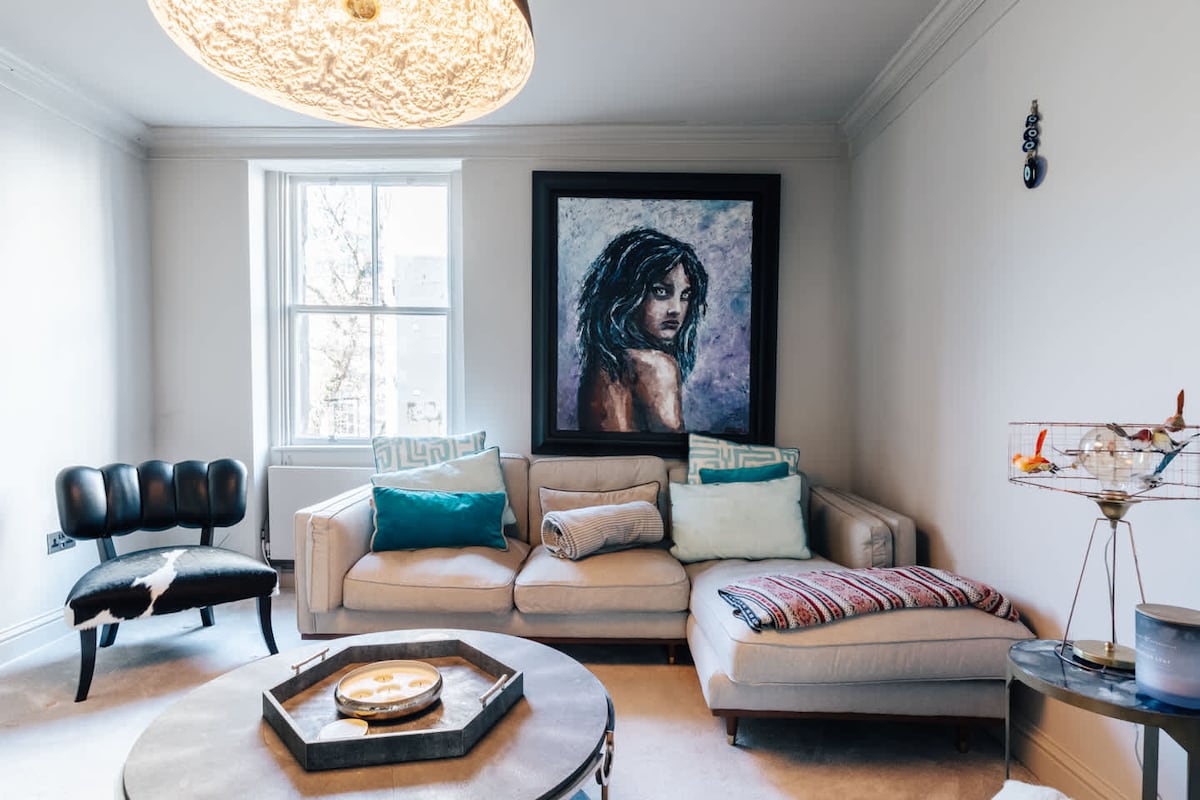 The living room links through from the kitchen and overlooks the rear courtyard garden below, similarly offering an oasis after a day on Bath’s busy streets. The sumptuous corner sofa gives ample sprawling space to the over-shopped, its plump cushions and faux fur throw positively encourage putting your feet up, kicking back to watch Prime and the usual channels on the wide-screen TV. A mid-morning latte sits on the faux shagreen Katia coffee table by Andrew Martin, or is it an espresso martini you’d prefer, sat in one of the cowhide chairs?