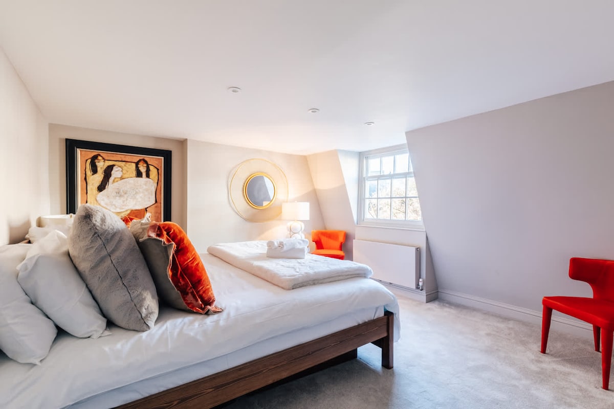 When it’s time to hit the hay, it’s up a flight of stairs, passing the Andrew Martin cubist sideboard on the half landing. The master double bed boasts puffy pillows and a pair of rich velvet cushions by The Tao of Cinderella - a former textile designer to Westwood and McQueen. This inspired the choice of Juno chairs by Andrew Martin, their sculptural silhouette glows in a delicious burnt orange. The second bedroom is also equipped with a comfortable king size bed. There’s premium quality 220 thread count Egyptian cotton bedding throughout.