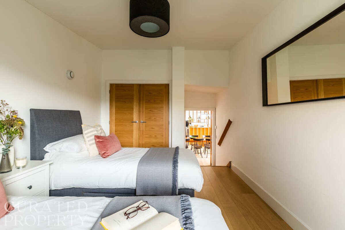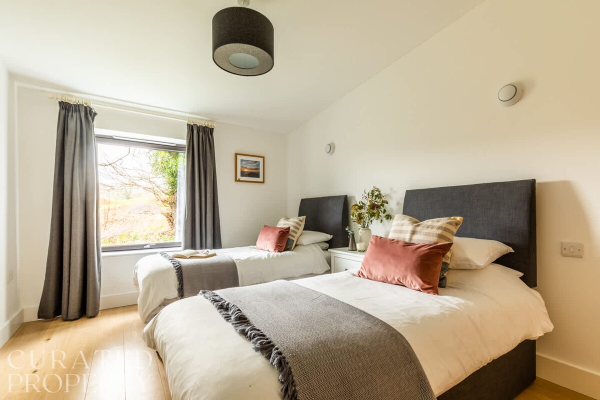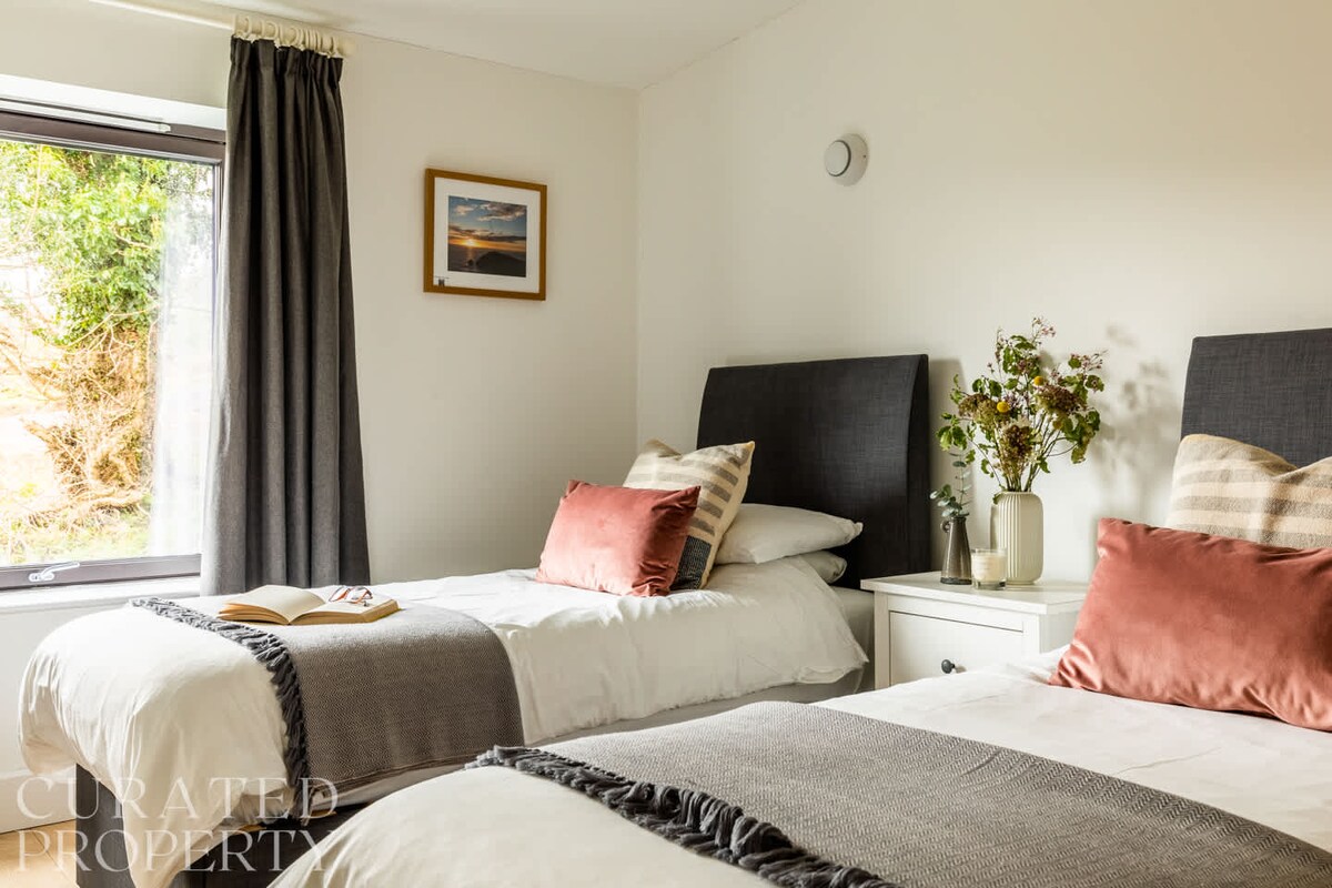 - Bedroom 5 is located to the north side of the building and features twin single beds.