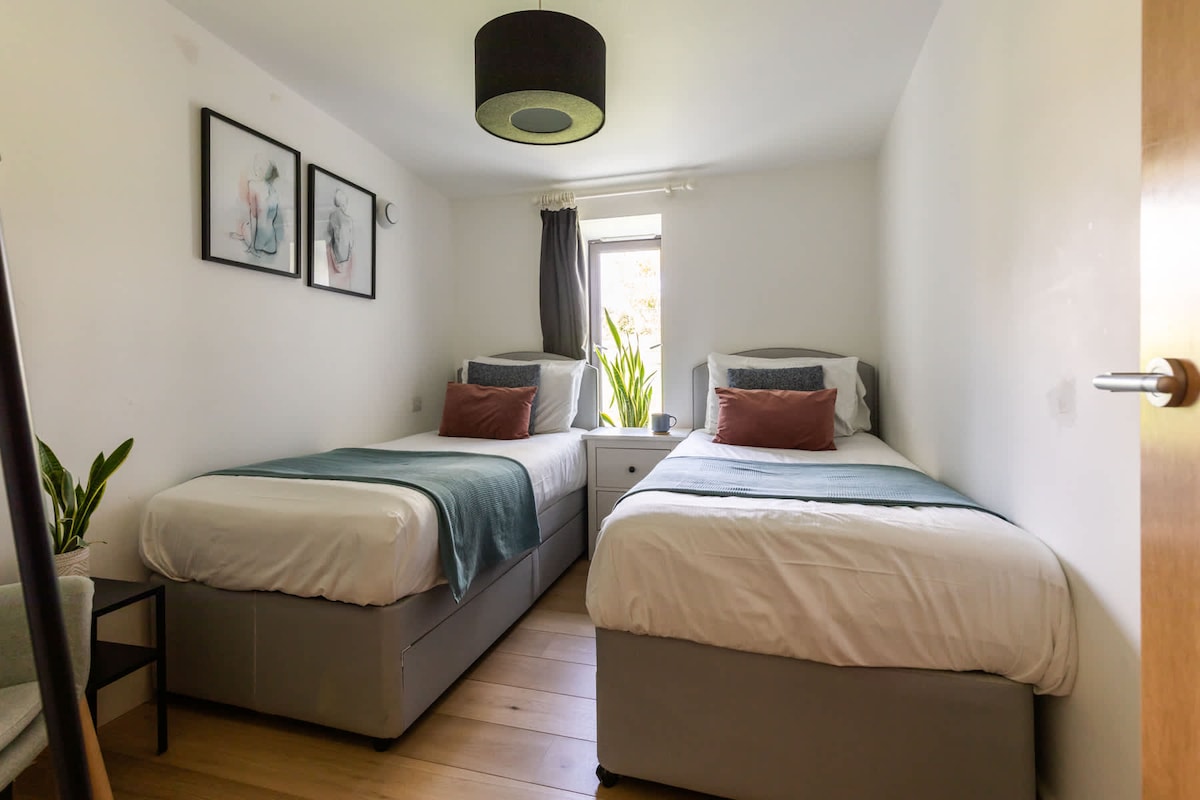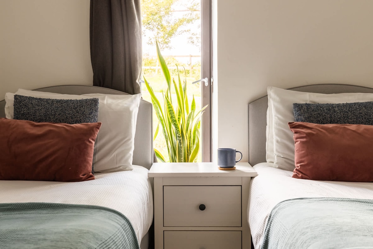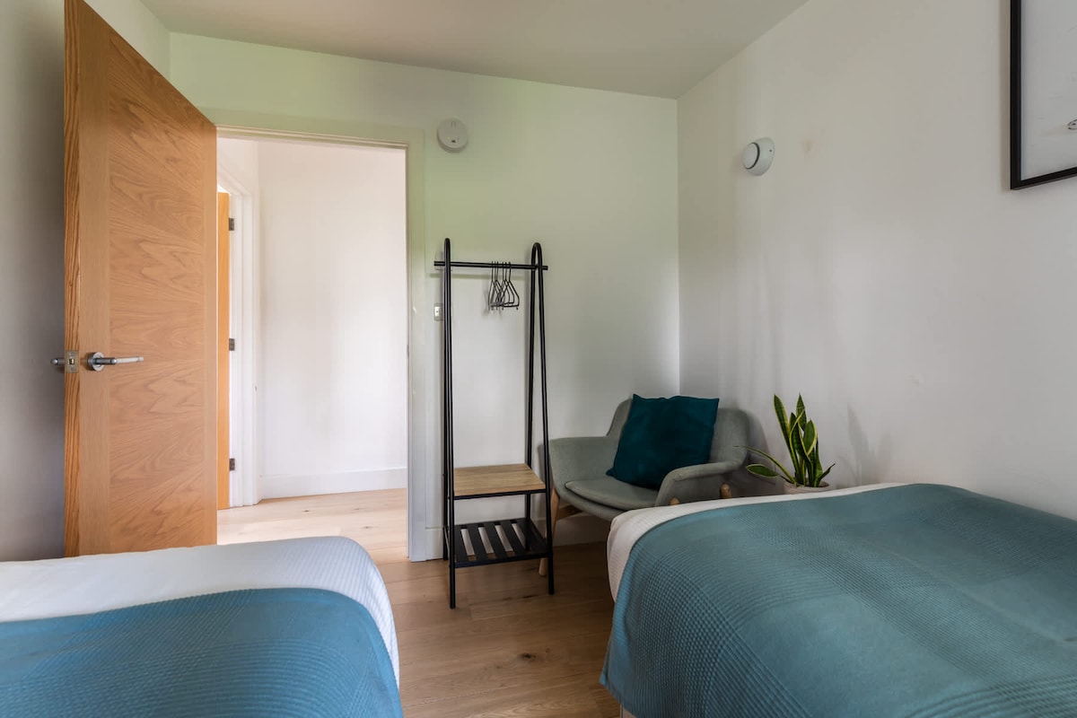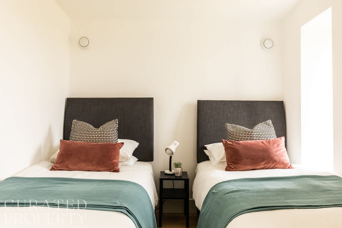 - Bedroom 5 is located to the north side of the building and features twin single beds.