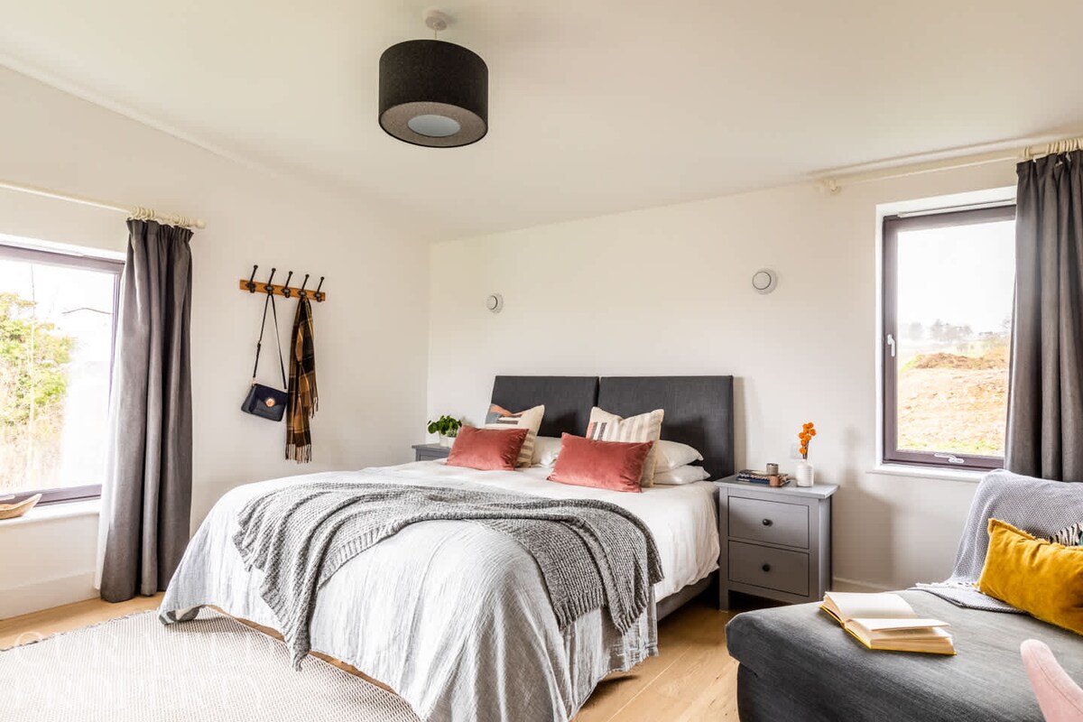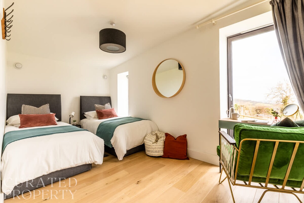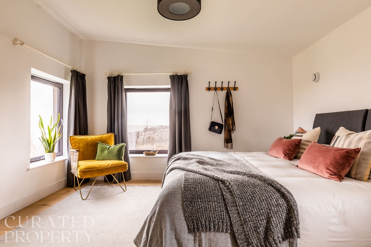 The main feature of the house is the large open plan kitchen, dining and living area, which occupies the south end of the building and the most spectacular views. The large kitchen is modern and fully equipped with high end fixtures and appliances, cooking utensils as well as a large island/breakfast bar - making it suitable for cooking substantial meals for the large group. The dining table comfortably seats 8 guests, where you can enjoy a home-cooked meal whilst admiring the valley views. The large living area provides a sociable area for guests to relax or open the patio doors to the south and enjoy the afternoon sun.Four of the five bedrooms occupy the western wing of The Ridge: