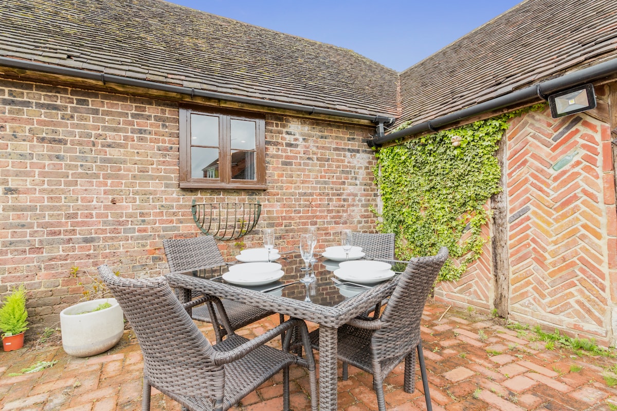 Outside, the large enclosed courtyard is the perfect spot to enjoy morning coffee, afternoon picnics, or candlelit suppers as the sun sets over the Downs.