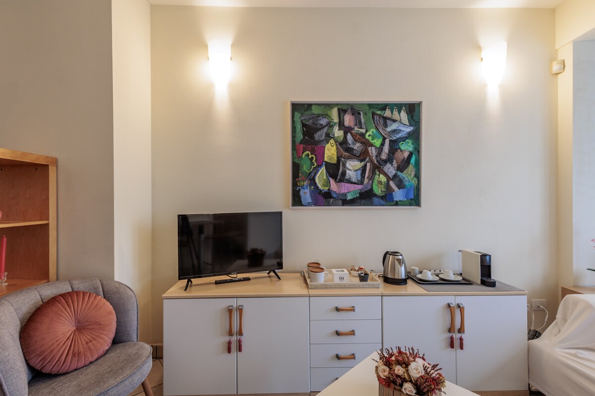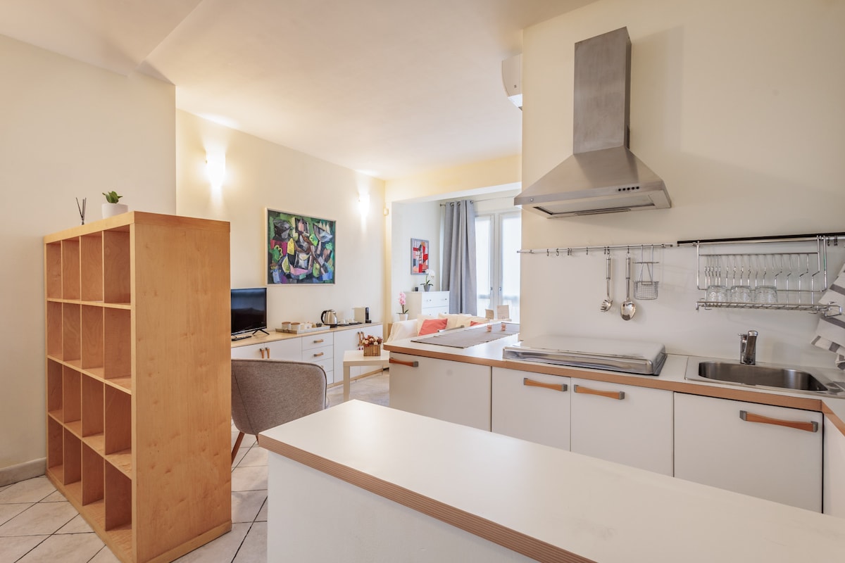 The interior space is organized as follows:KITCHENETTE with induction cooktop, Raised table with stools, refrigerator, coffee machine, kettle, microwave, kitchen utensils, and wine glasses;
