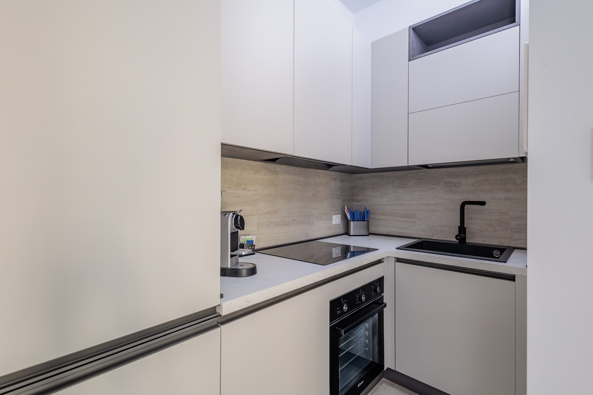 - LIVING ROOM with KITCHENETTE (equipped with an induction cooktop, refrigerator with freezer, coffee machine, dishwasher, kettle, oven, microwave, kitchen utensils, and wine glasses), single sofa bed, dining table, and TV;