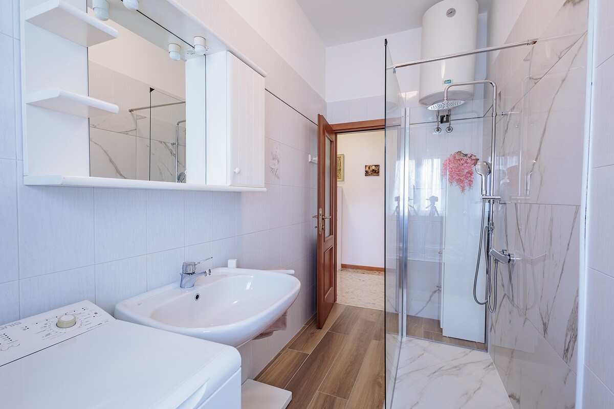 - BATHROOM with shower, washing machine, sink, bidet, and toilet.
