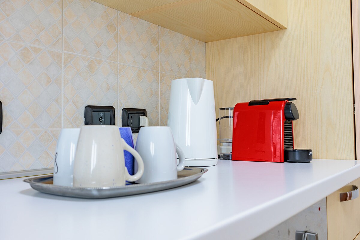 The interior space is organized as follows:- KITCHEN with gas stove, refrigerator with freezer, coffee machine, kettle, electric oven, toaster, kitchen utensils, wine glasses, dining table, access to Balcony I, and ceiling fan;