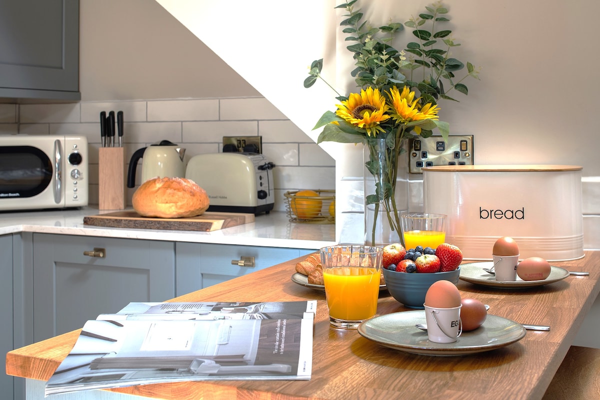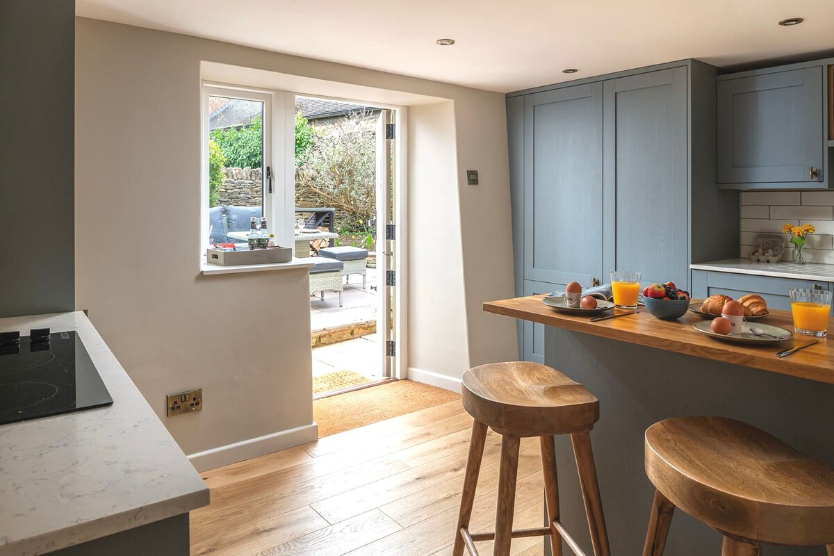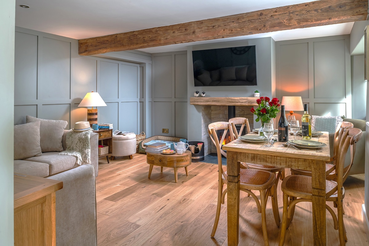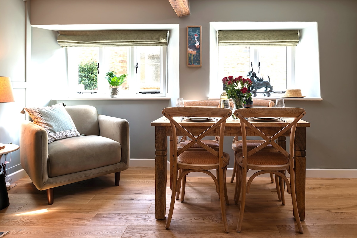 Access to the cottage is next to the private parking space. The key box is next to the front door. There is a brand new kitchen with seated island and a large dining room with a brand new comfortable sofa, dining table, log burner and a SMART TV.