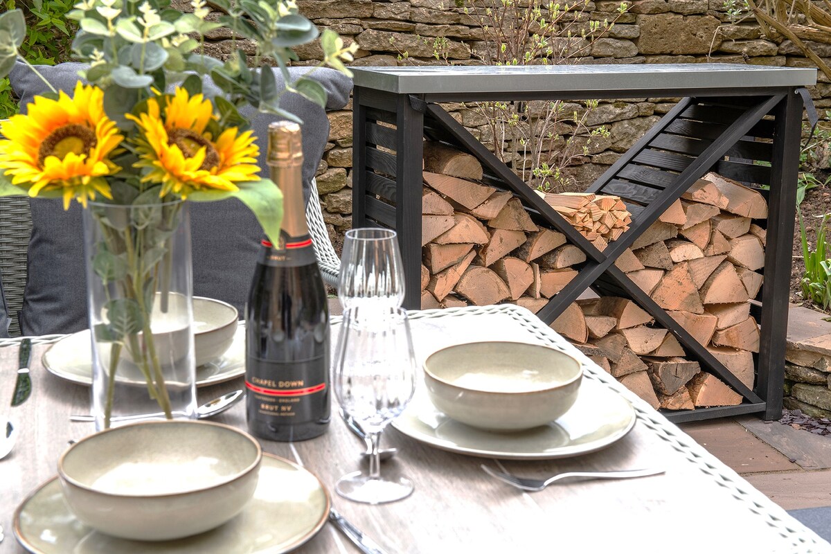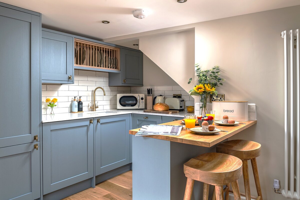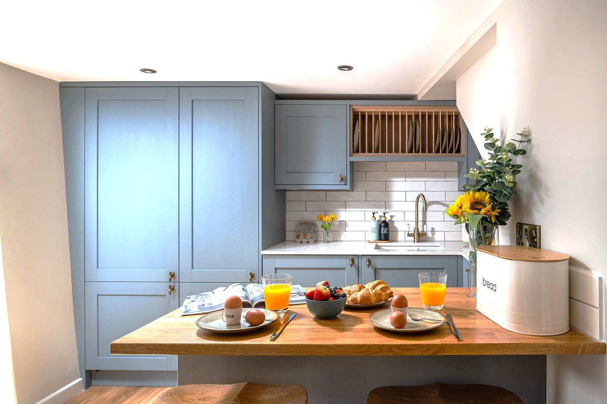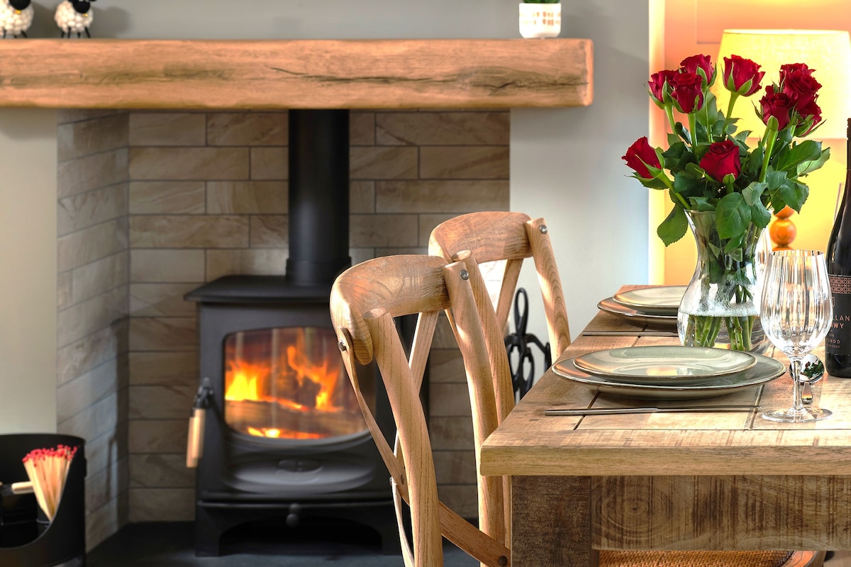 Access to the cottage is next to the private parking space. The key box is next to the front door. There is a brand new kitchen with seated island and a large dining room with a brand new comfortable sofa, dining table, log burner and a SMART TV.