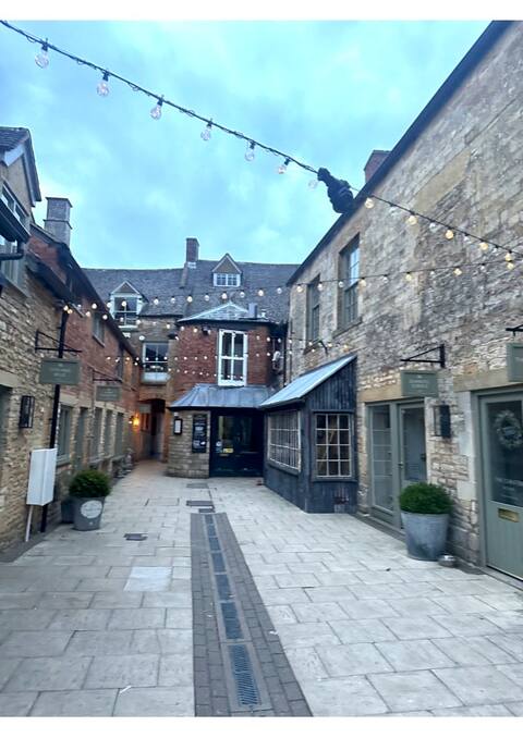 Entrance to the property is under the Arch which leads from Sheep Street into Windrush Court. It is a hidden gem in a very central location but it is also very quiet.Access to the cottage is next to the private parking space. The key box is next to the front door. There is a brand new kitchen with seated island and a large dining room with a brand new comfortable sofa, dining table, log burner and a SMART TV.