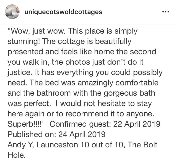 The bolt hole was an idyllic little place to spend a long weekend. Amanda was so accommodating and a great communicator before we arrived, providing a perfect amount of info about the property, the village and the local area. The space - the bathroom was a highlight and the bath a real treat. The kitchen is really nice and a lovely area to have nice leisurely breakfasts in. The village - the village is charming and classically “cotswolds” and isn’t as touristy as some of the other popular towns in the area. Would stay again and recommend to others