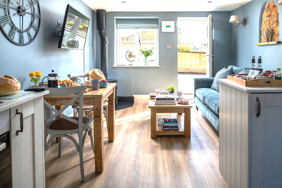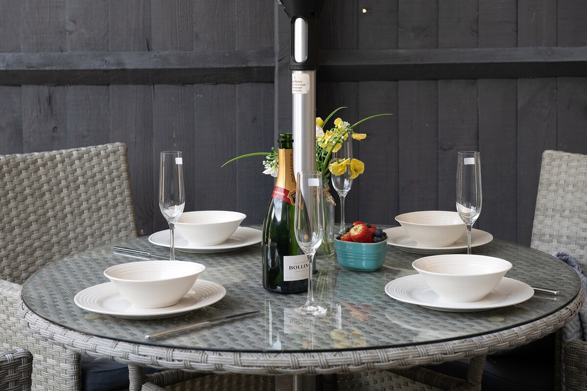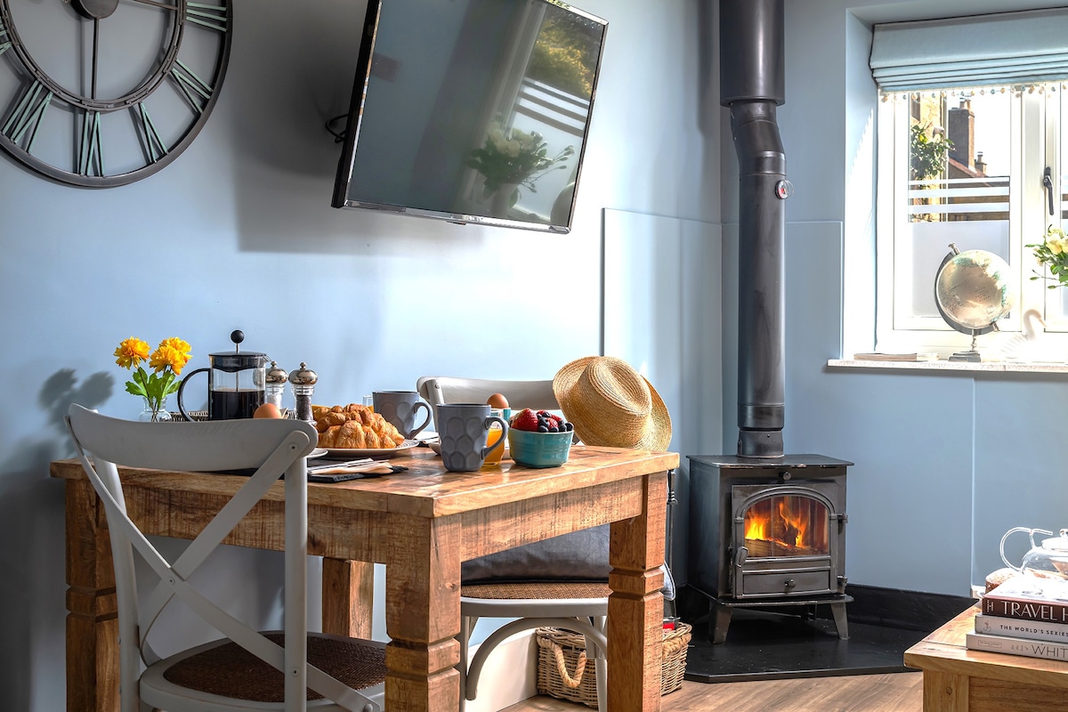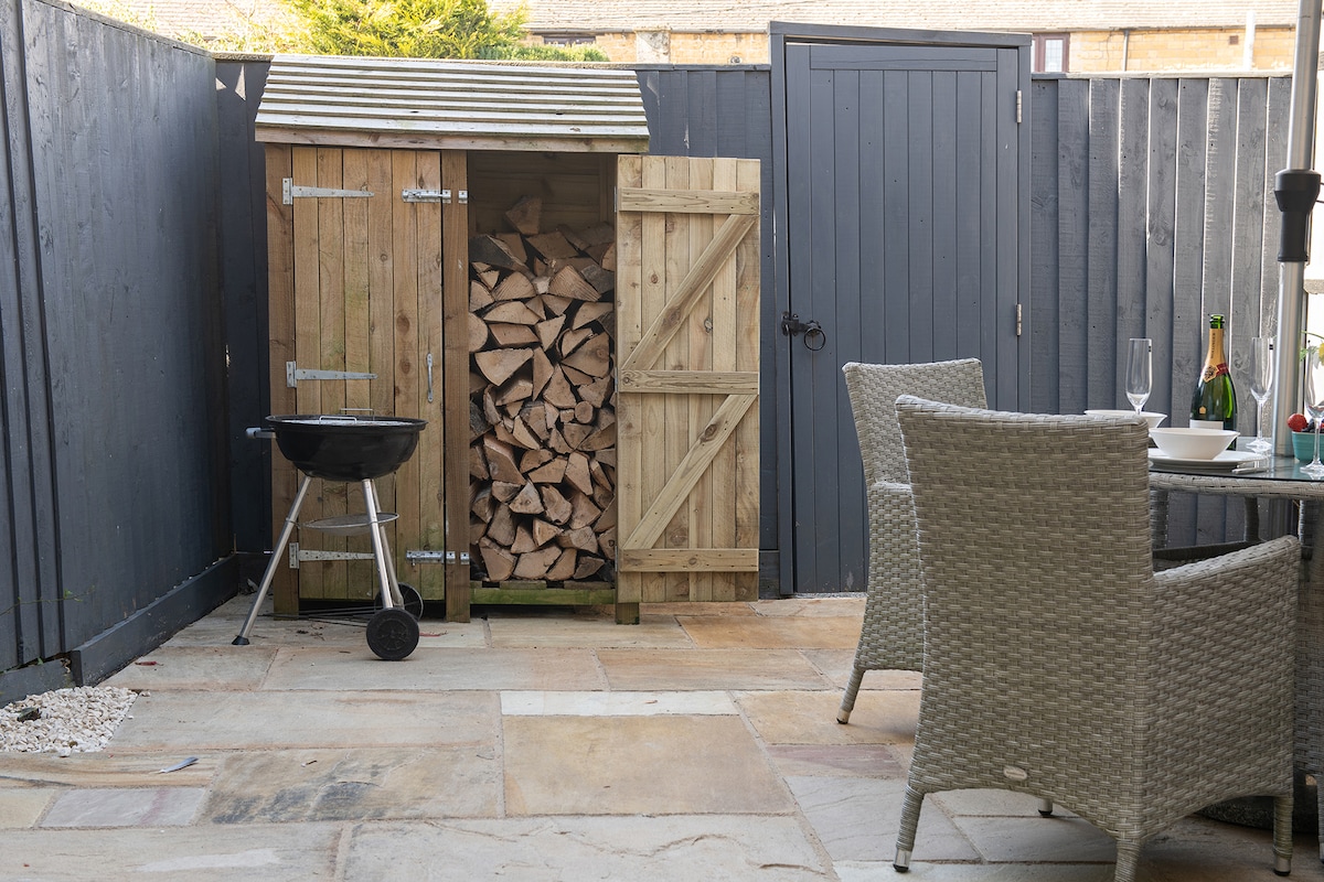 The delightful open plan living/dining/kitchen space has every appliance you should need as well as a log-burner and wall-mounted Smart TV. Appliances are Bosch and Neff, and include a washing machine, dishwasher, 4-ring hob, double oven, fridge with freezer box and microwave.The stable door in the kitchen leads to the charming, private patio garden with Weber barbeque, Bramblecrest table and chairs for outdoor dining and outdoor sofa so you can enjoy the morning papers.