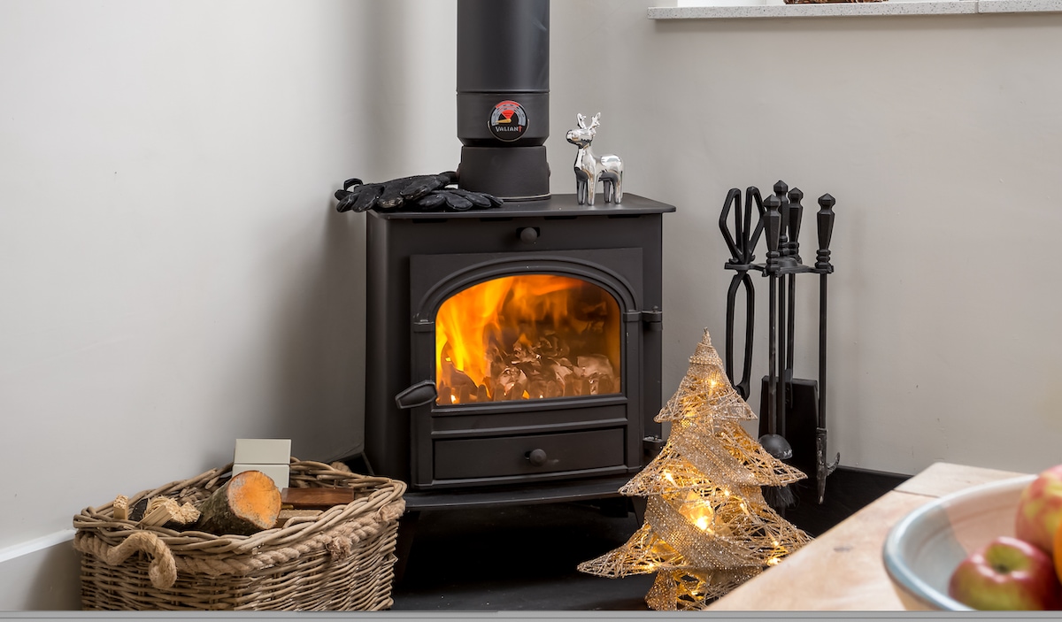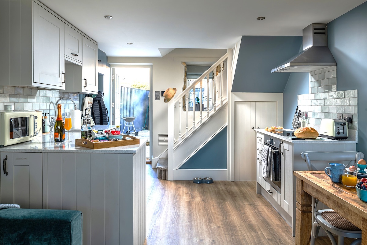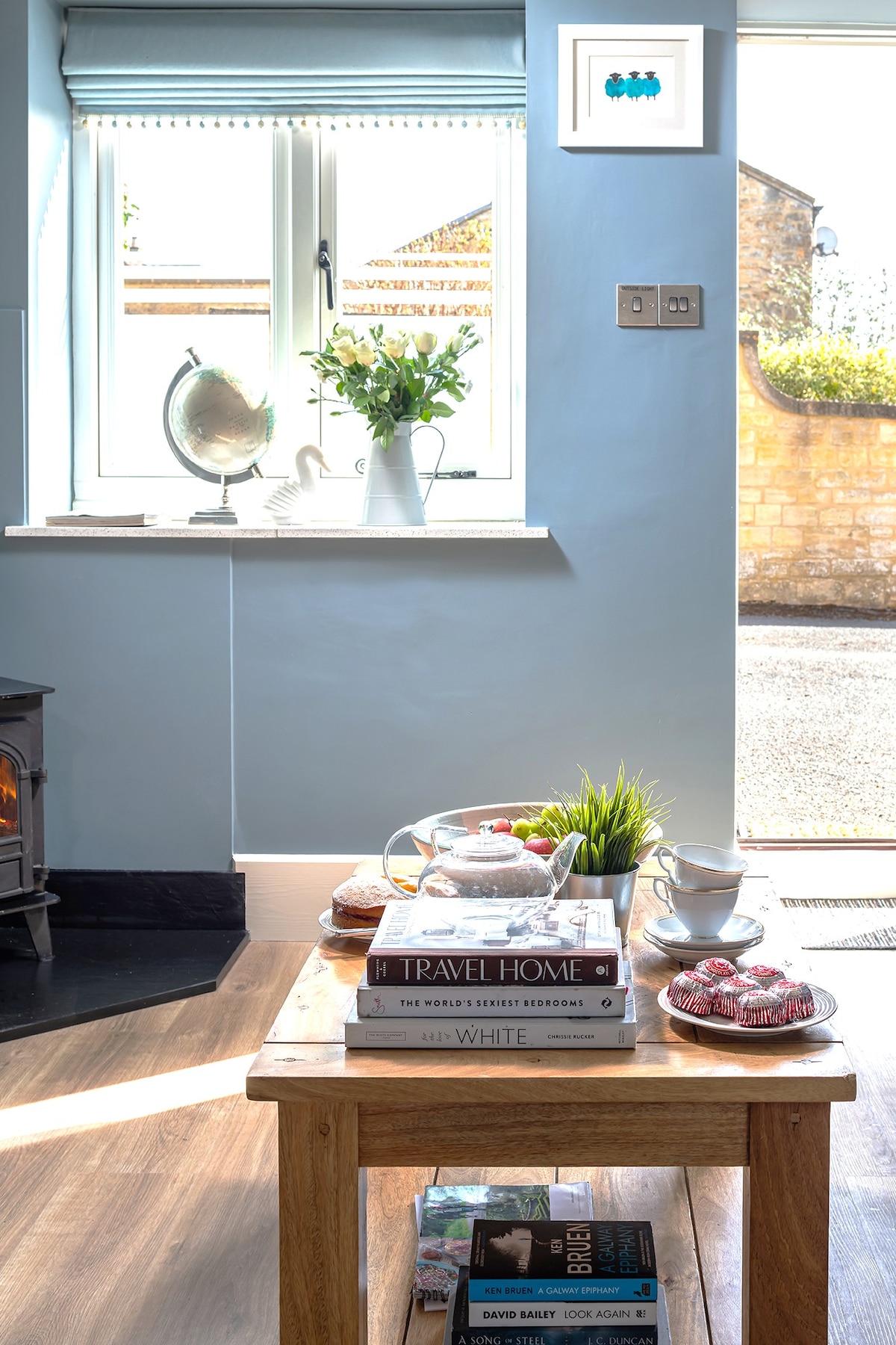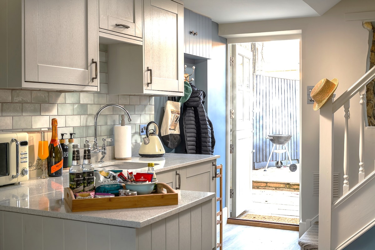 The delightful open plan living/dining/kitchen space has every appliance you should need as well as a log-burner and wall-mounted Smart TV. Appliances are Bosch and Neff, and include a washing machine, dishwasher, 4-ring hob, double oven, fridge with freezer box and microwave.The stable door in the kitchen leads to the charming, private patio garden with Weber barbeque, Bramblecrest table and chairs for outdoor dining and outdoor sofa so you can enjoy the morning papers.