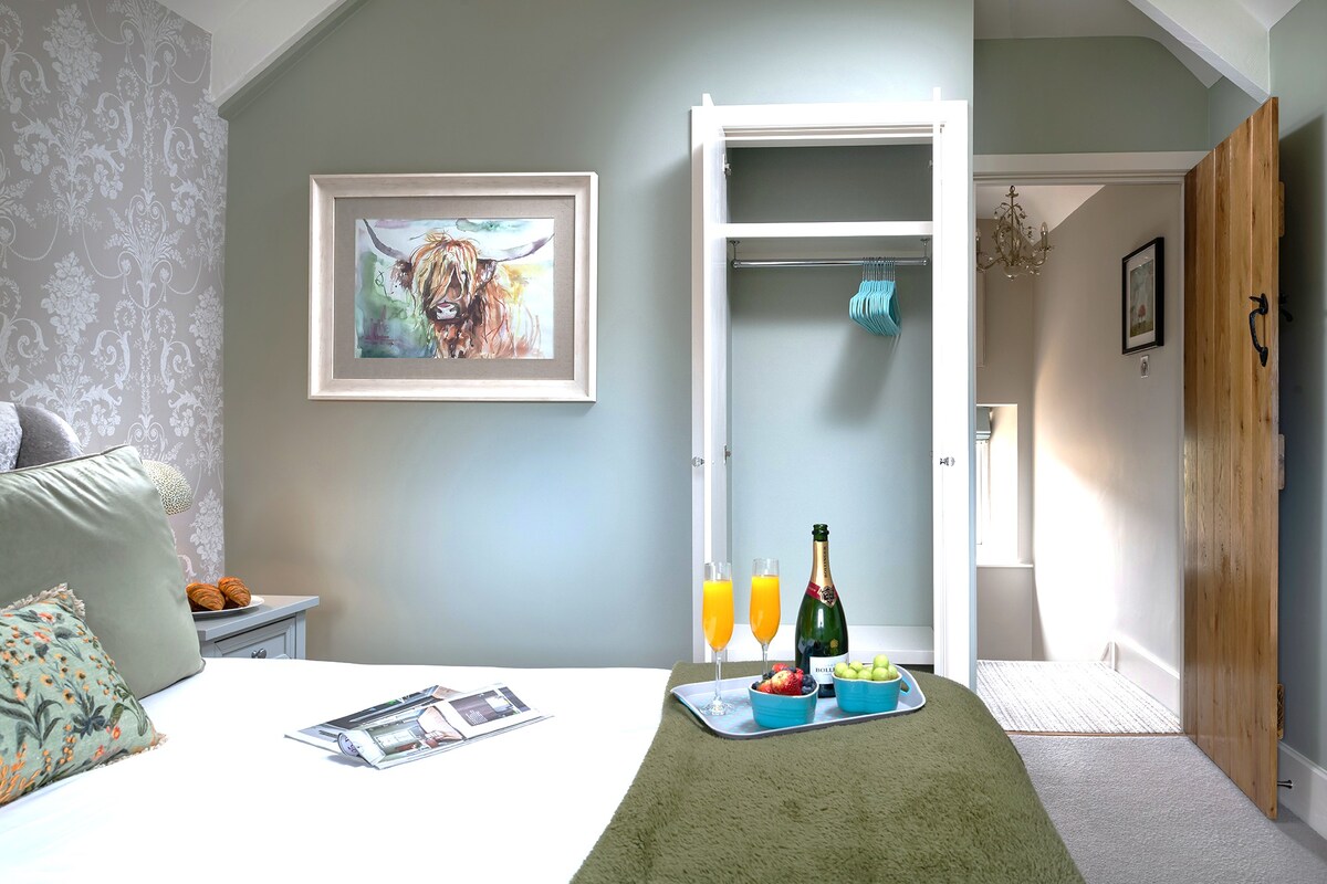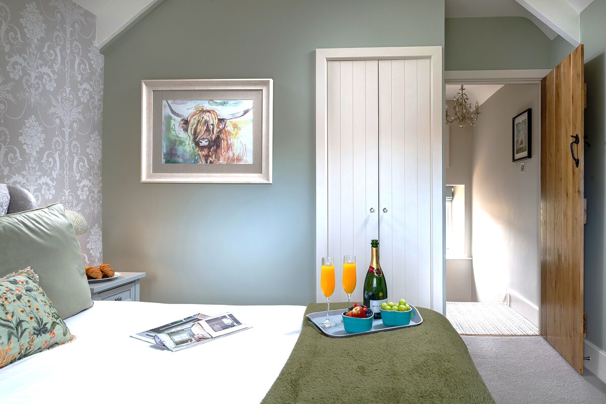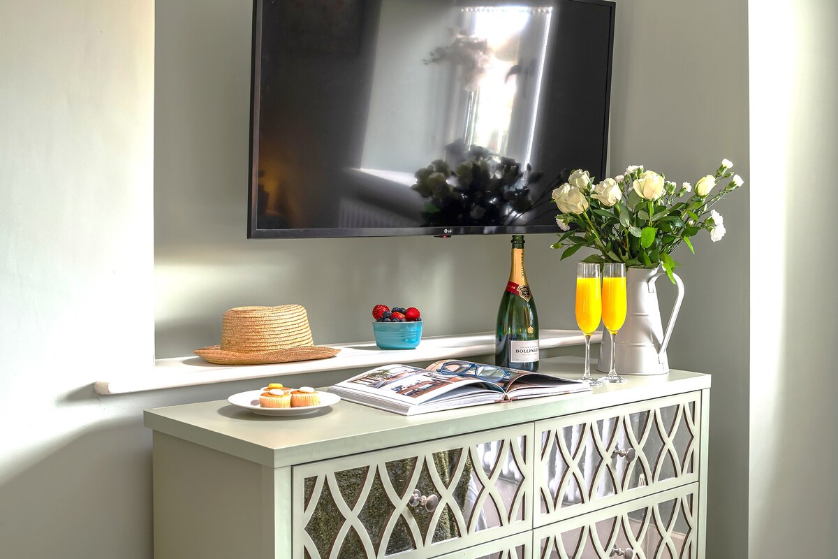 The first floor bedroom provides a place of sanctuary with its 500+ thread-count cotton bed linen, large king size bed and wall-mounted Smart TV. The feature roll-top bath and separate rain shower, in the bathroom complete with Egyptian cotton towels provide a place to relax and unwind after a day out.
