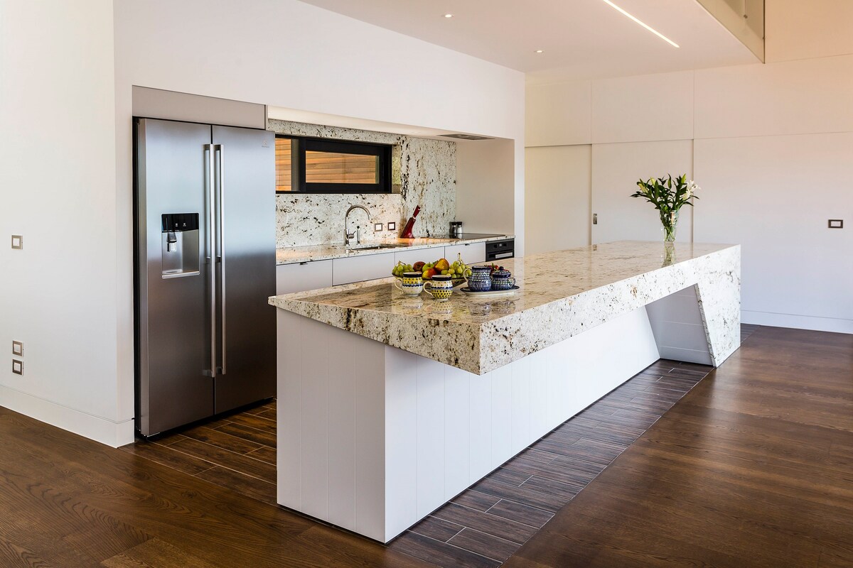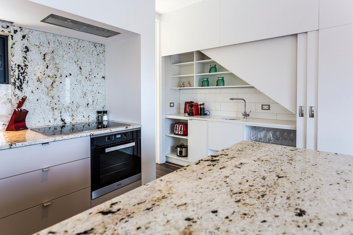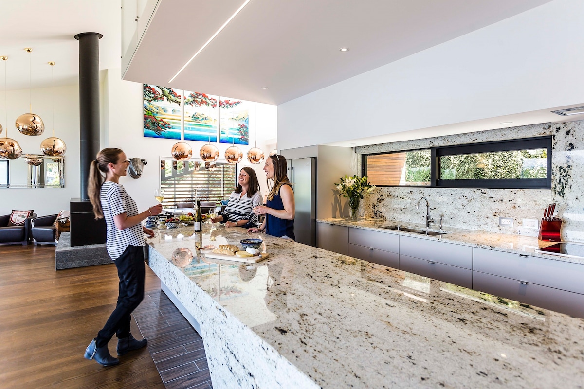 The kitchen is a modern and stylish space with high-end appliances, perfect for entertaining, with a large stunning quartz benchtop providing ample space and a breakfast bar for casual dining. Fully equipped with induction hobs, brand new appliances, and Nespresso coffee machine, all the necessary elements for preparing in-home lakeside meals and entertaining.