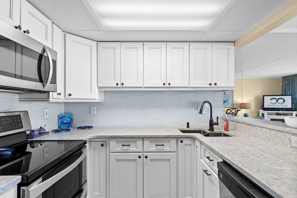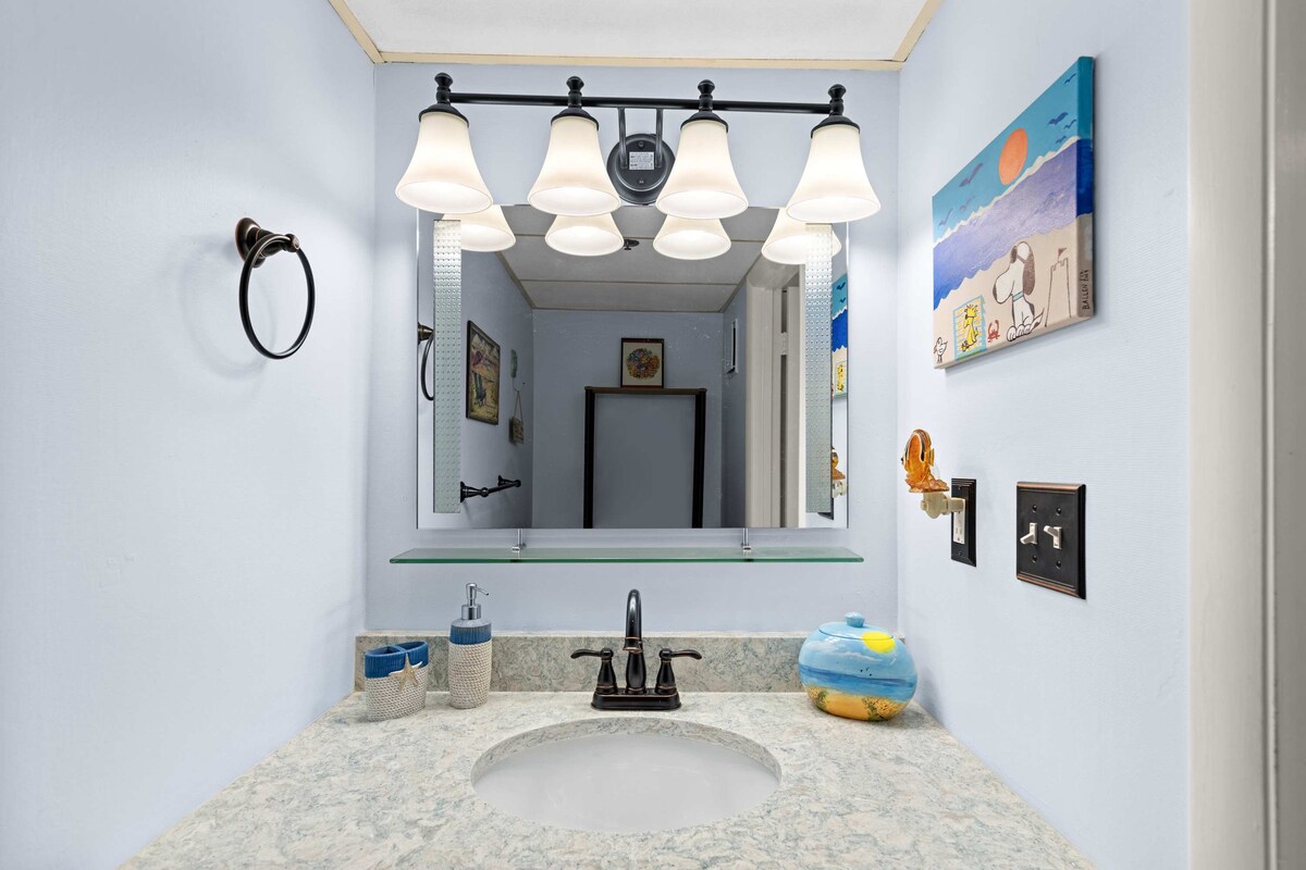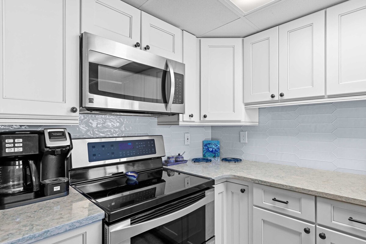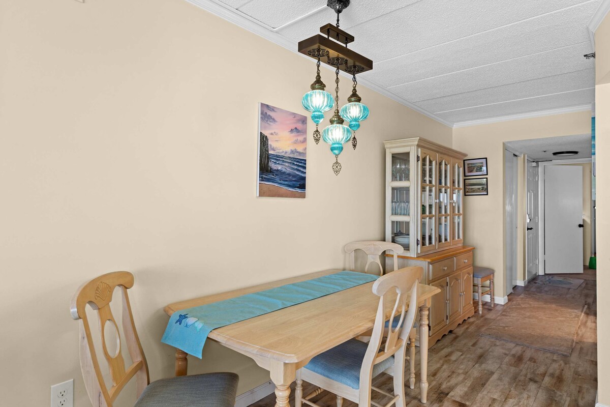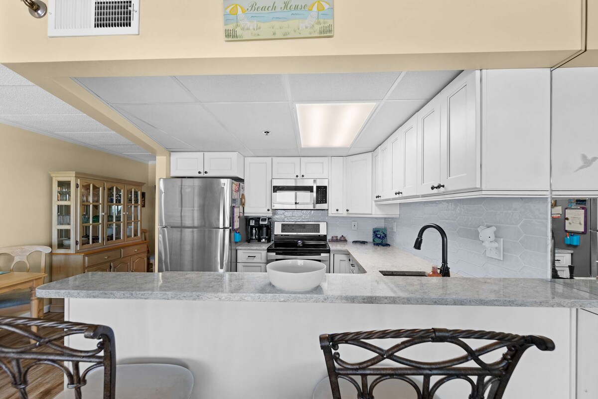 Wake up to stunning ocean views at La Mirage 203, a cozy 1-bedroom, 1.5-bath oceanfront condo perfect for couples or small families. With direct beach access, a private balcony, and comfortable coastal décor, this unit makes it easy to relax and enjoy Ocean City living.Step into the open-concept living area featuring an electric fireplace, Xfinity cable TV, and a portable fan for added comfort. The fully equipped kitchen includes a Hamilton Beach FlexBrew coffee maker and all the essentials for preparing meals. A half bath and washer/dryer are conveniently located nearby.