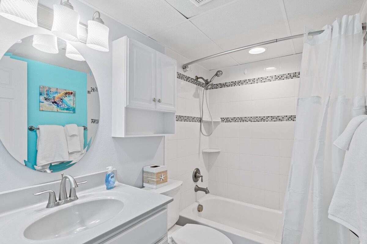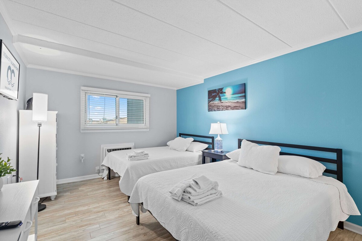 Inside, the open-concept living space features soft coastal décor, plenty of natural light, and comfortable seating for relaxing after a day in the sun. Stream your favorite shows on one of the two Smart TVs, connect to high-speed Wi-Fi, or unwind with a board game or good book. The bedroom includes both a queen and full bed, a Smart TV, dresser, and room-darkening shades, while 1.5 bathrooms and in-unit laundry add convenience throughout your stay.