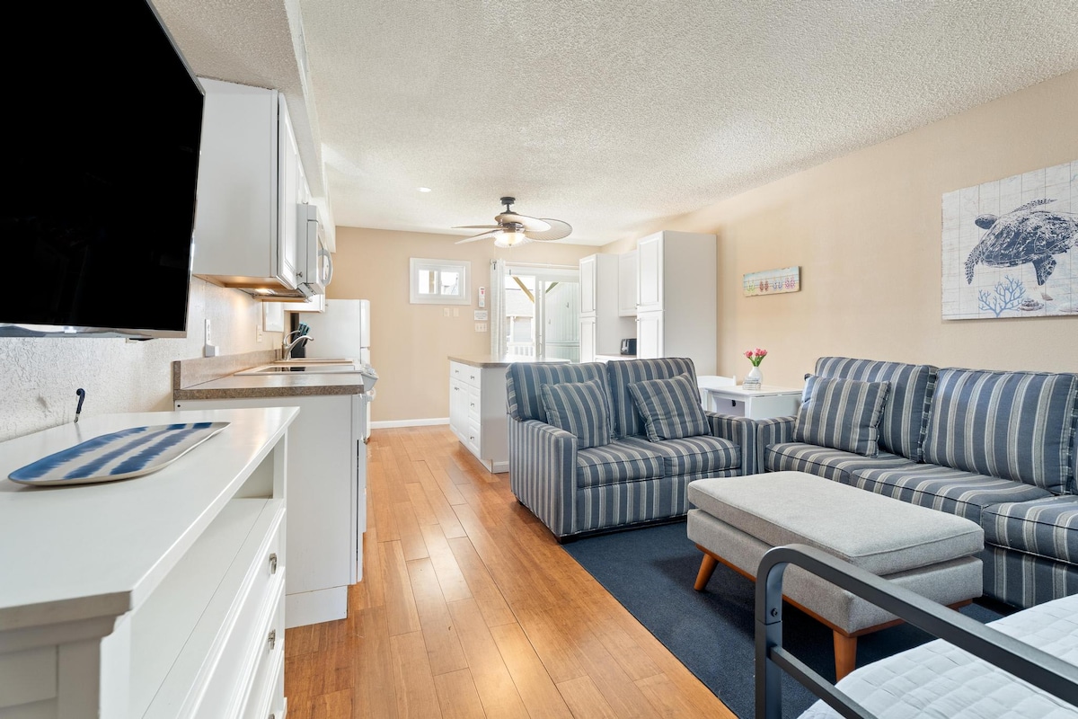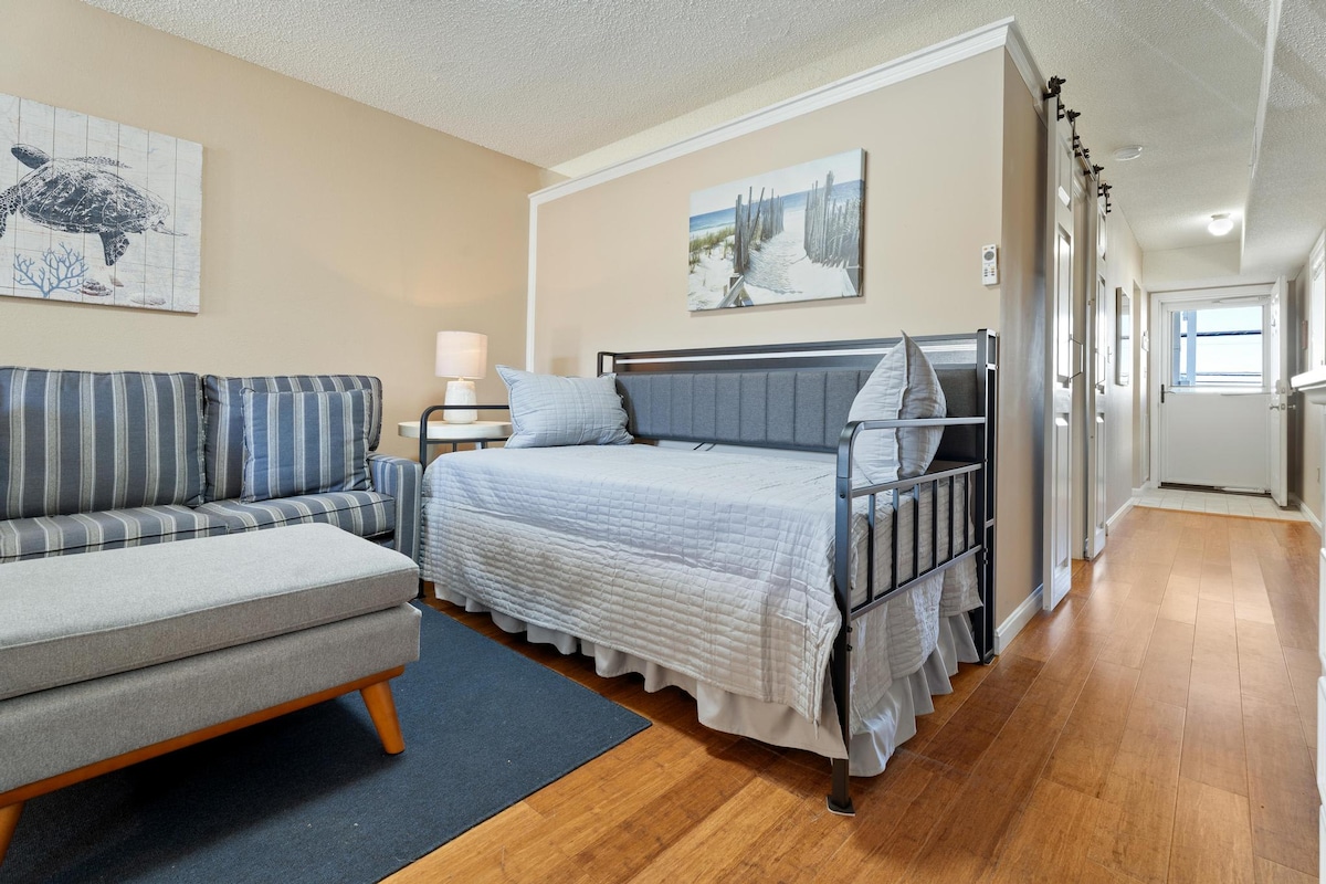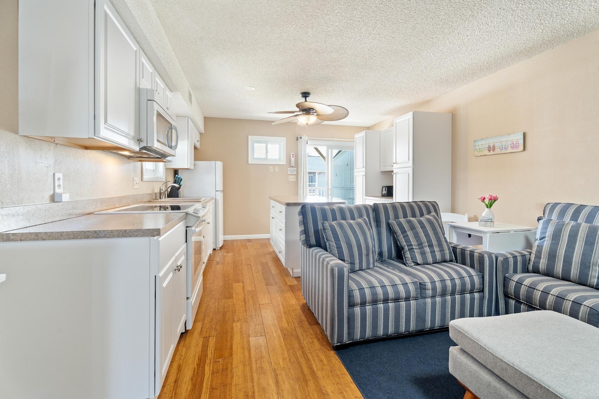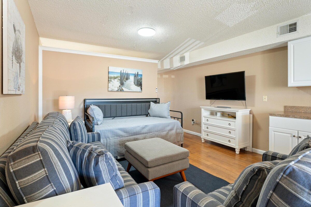 The open layout features a queen sleeper sofa, a single daybed, and a private bedroom with a plush queen bed — offering flexibility and comfort for up to five guests. Whip up a quick breakfast before heading to the sand, or unwind after a day of exploring with your favorite shows on the Smart TV.