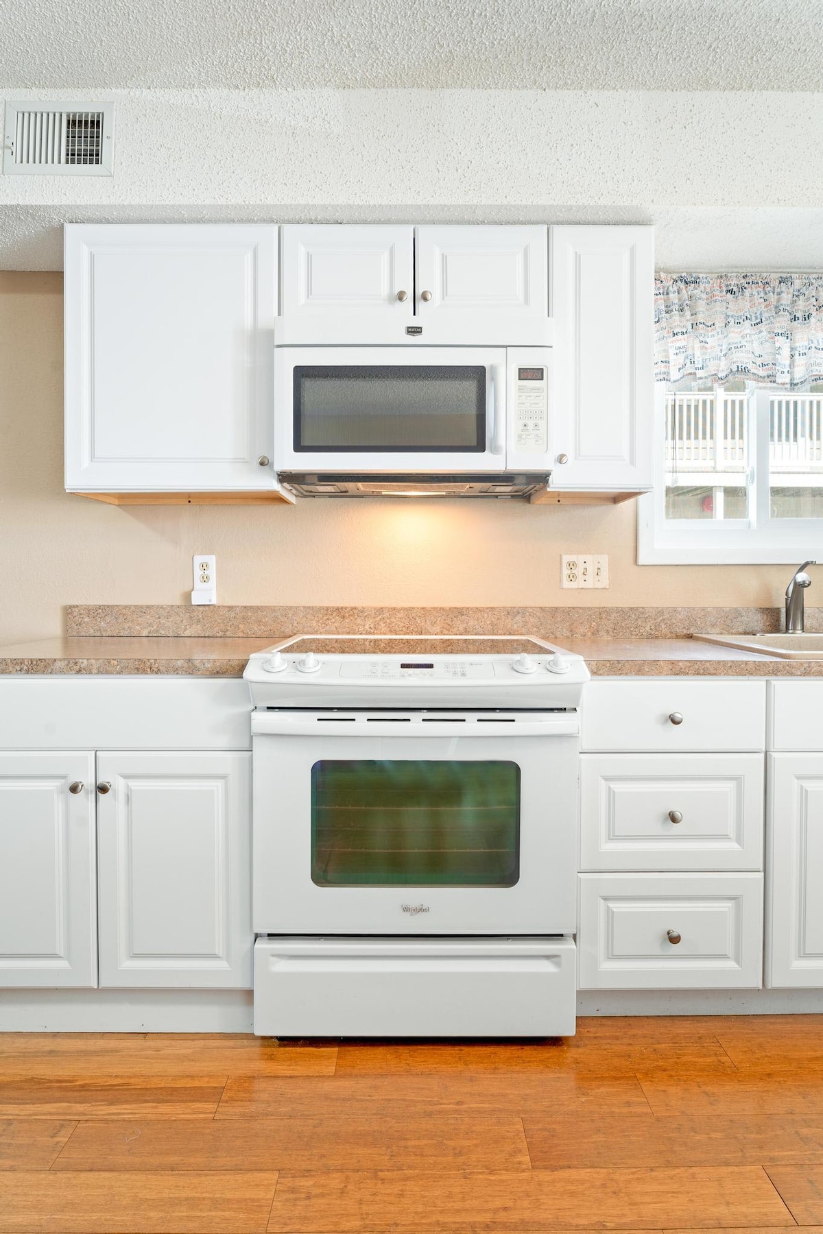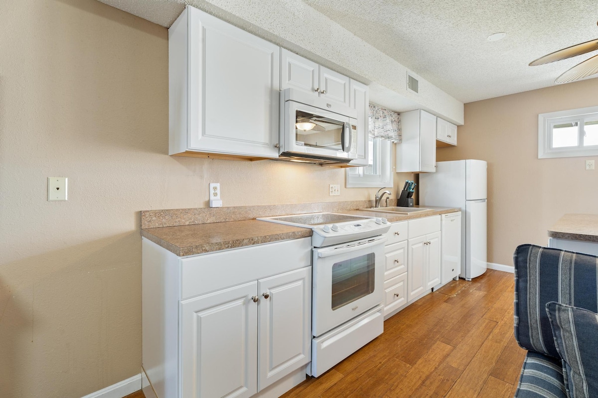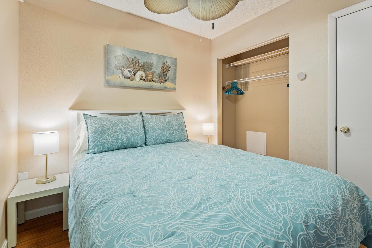 The open layout features a queen sleeper sofa, a single daybed, and a private bedroom with a plush queen bed — offering flexibility and comfort for up to five guests. Whip up a quick breakfast before heading to the sand, or unwind after a day of exploring with your favorite shows on the Smart TV.