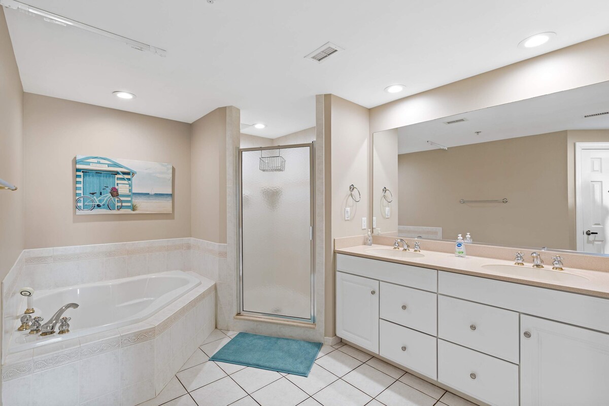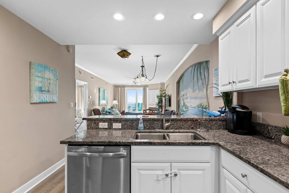 Inside, natural light fills the open living area, where multiple sofas and recliners invite you to relax after a day at the beach. Gather around the gas fireplace or stream your favorite shows on the flat-screen TV for a cozy night in. The fully equipped kitchen features polished stainless steel appliances, granite countertops, a Keurig pod-style coffee maker, and a Mr. Coffee drip coffee maker—perfect for slow mornings with the family.