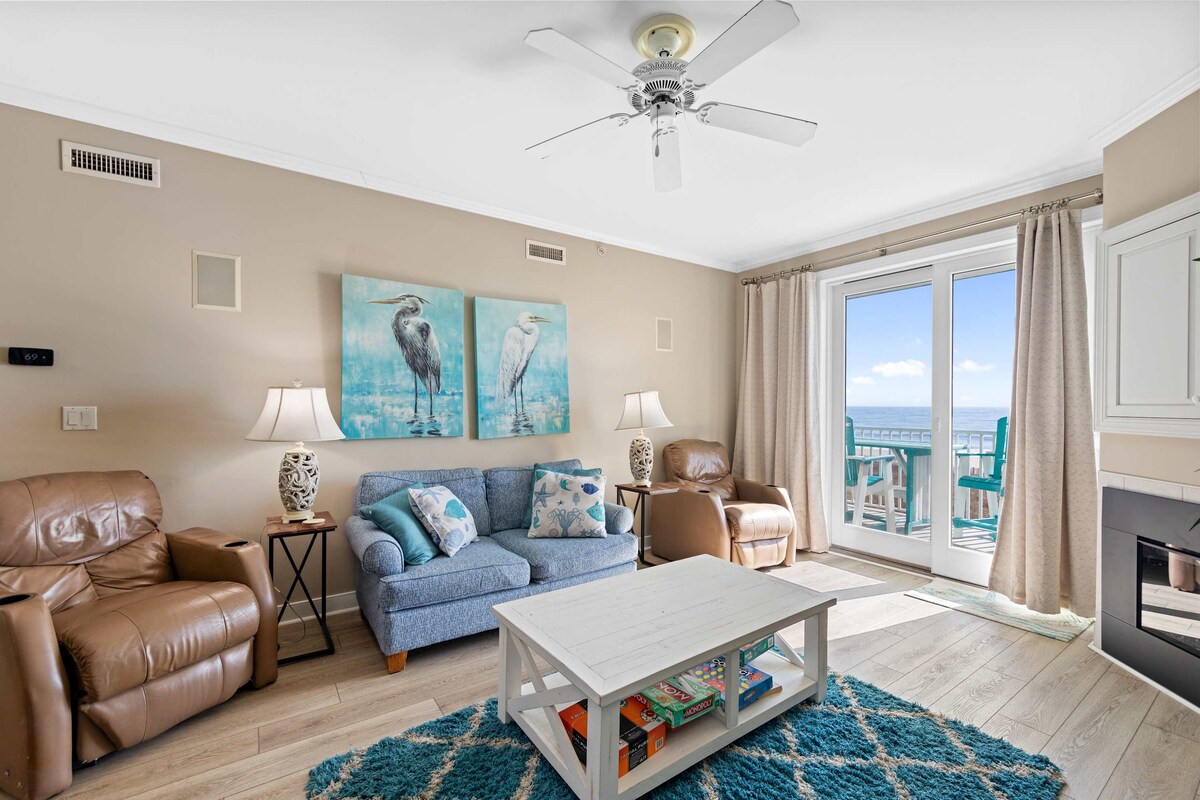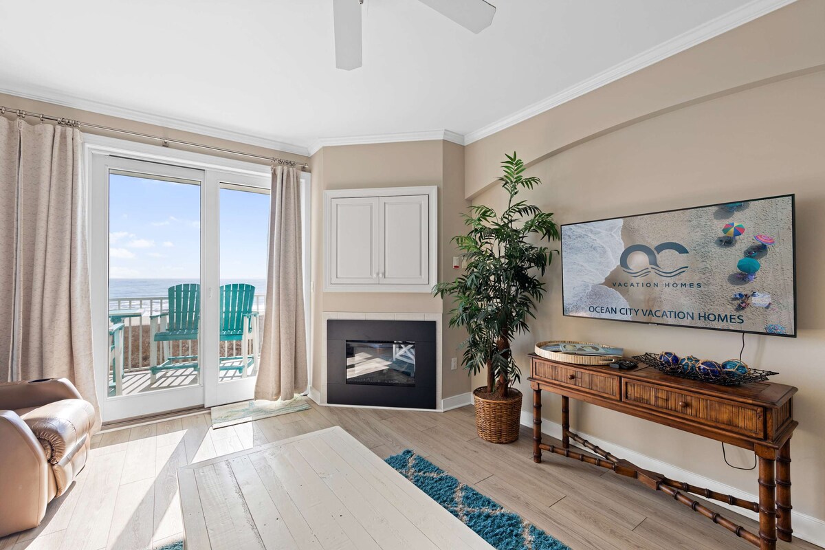 Experience the ultimate beachfront getaway at Adagio 302, a stunning three-bedroom, three-bath condo perched directly on the sand in midtown Ocean City. Wake up to the sound of the waves, sip your morning coffee on the private balcony, and watch the sunrise over the Atlantic without ever leaving home base.Inside, natural light fills the open living area, where multiple sofas and recliners invite you to relax after a day at the beach. Gather around the gas fireplace or stream your favorite shows on the flat-screen TV for a cozy night in. The fully equipped kitchen features polished stainless steel appliances, granite countertops, a Keurig pod-style coffee maker, and a Mr. Coffee drip coffee maker—perfect for slow mornings with the family.