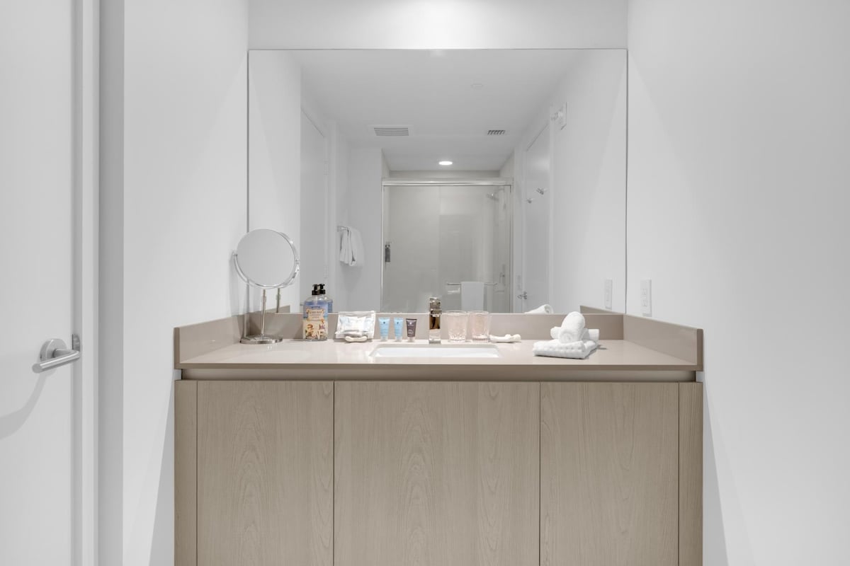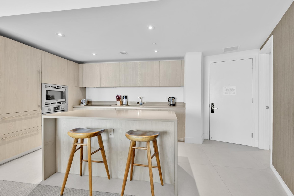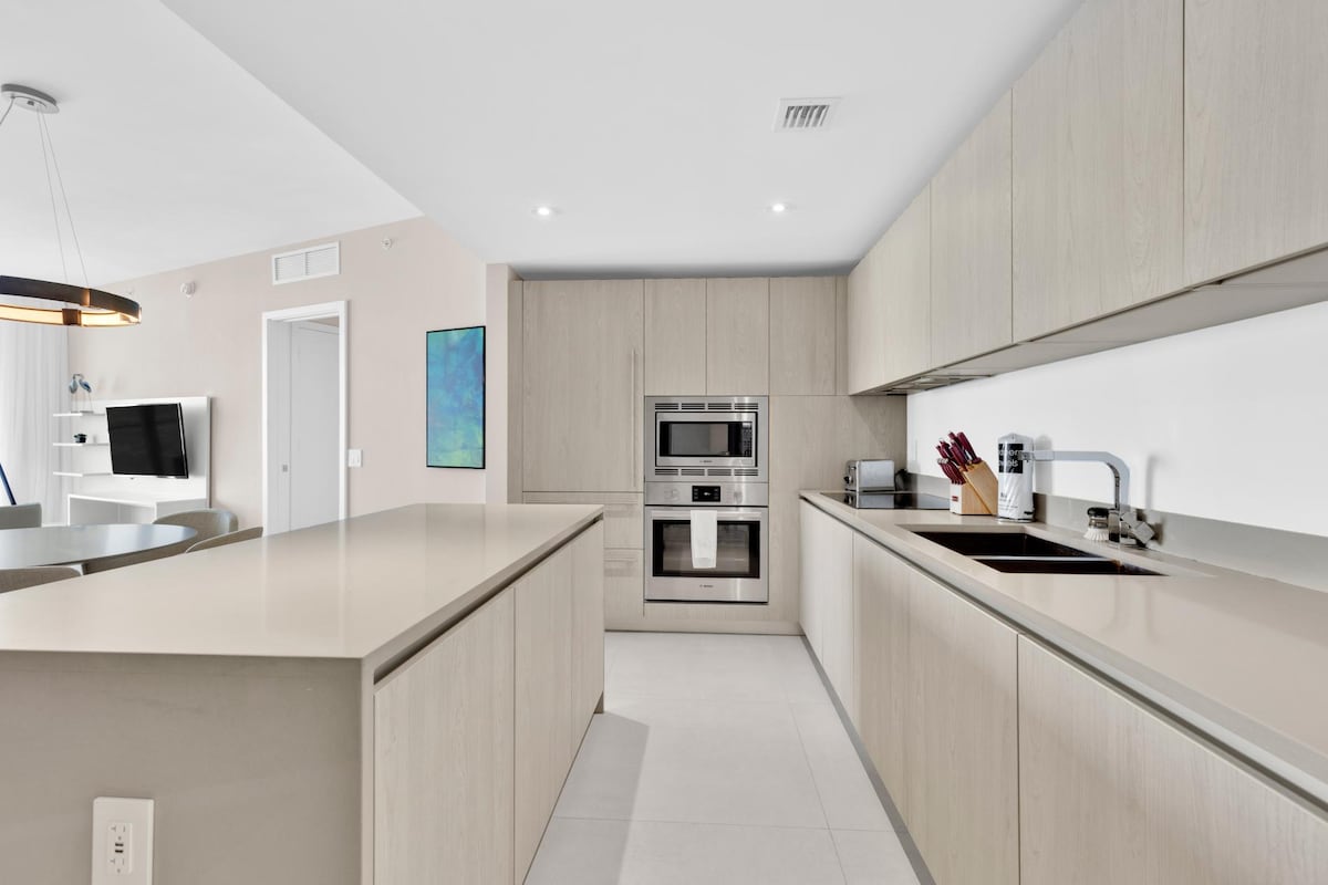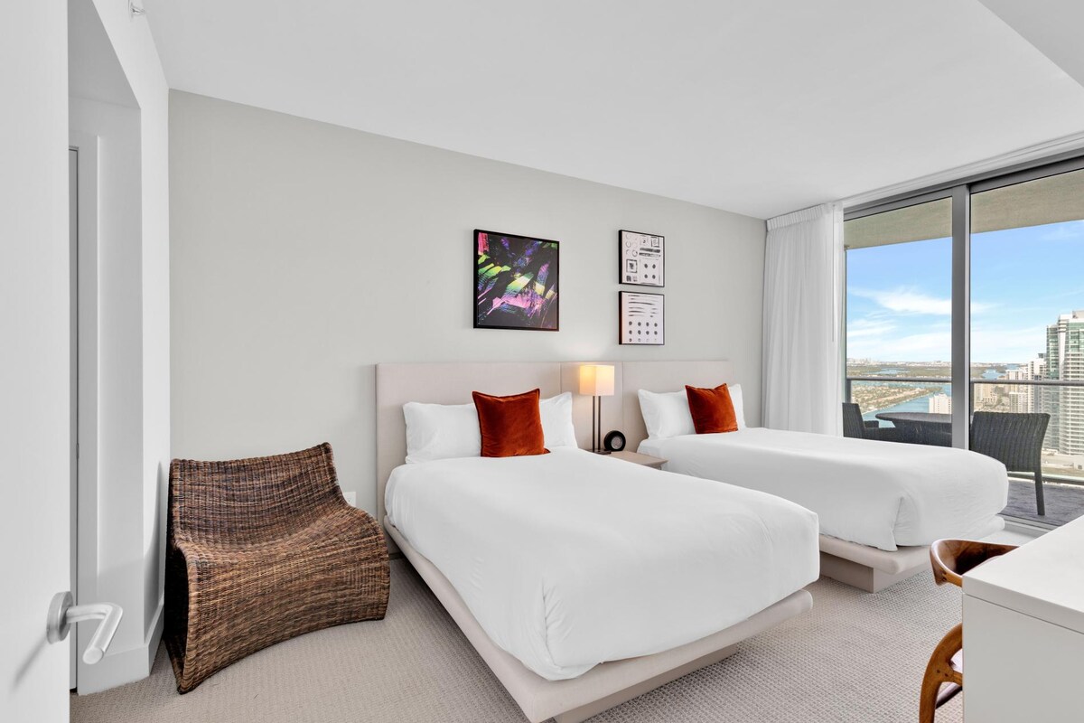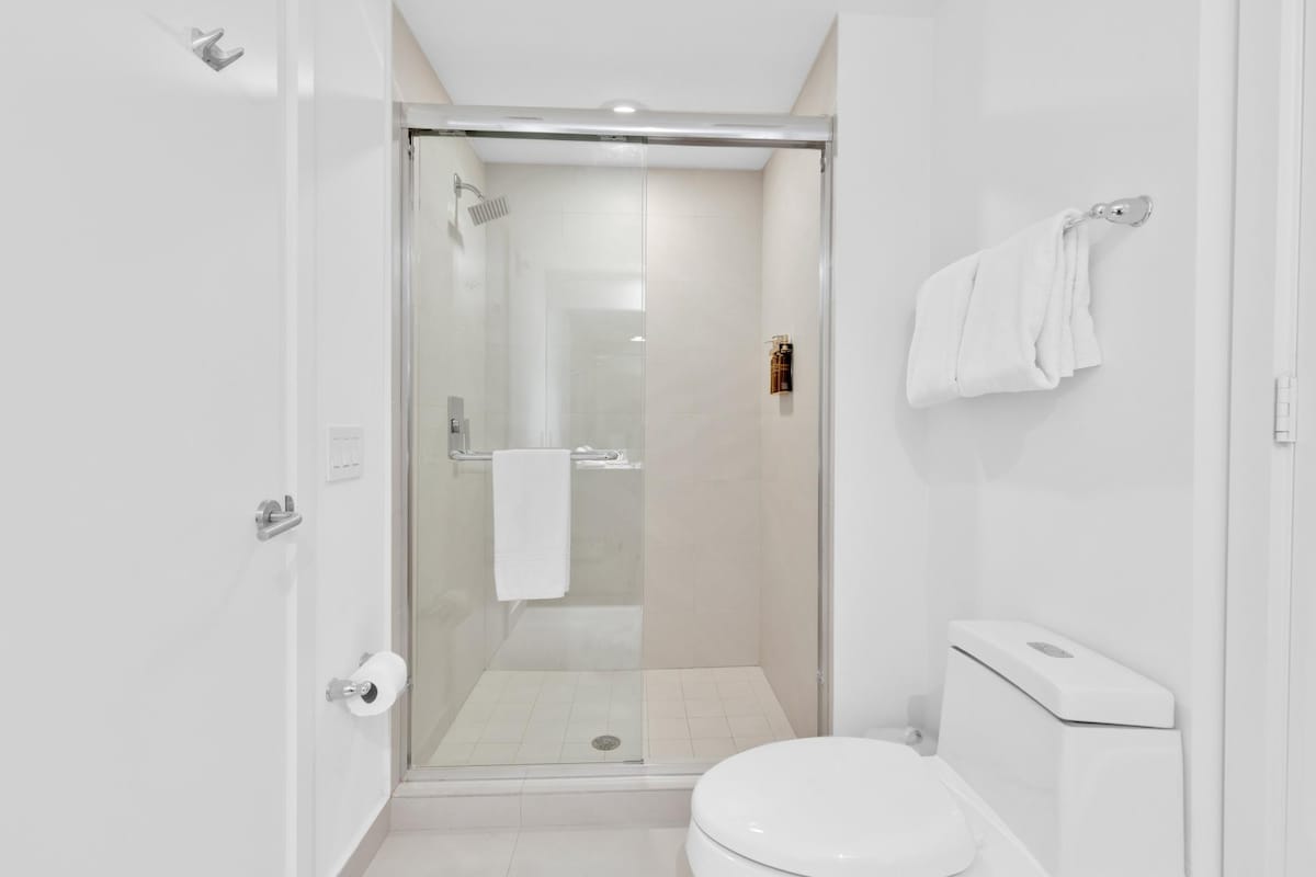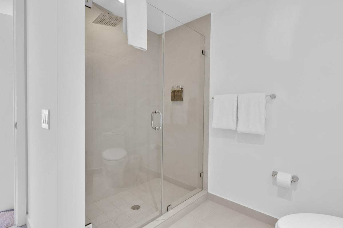 Master bedroom with a king-size bed and a private bathroom. The second bedroom has two full-size beds. The unit has another full bathroom with a glass shower box. Fully equipped kitchen integrated into the spacious living and dining room area. The living room has a sofa bed that can accommodate two guests. A washer and Dryer are