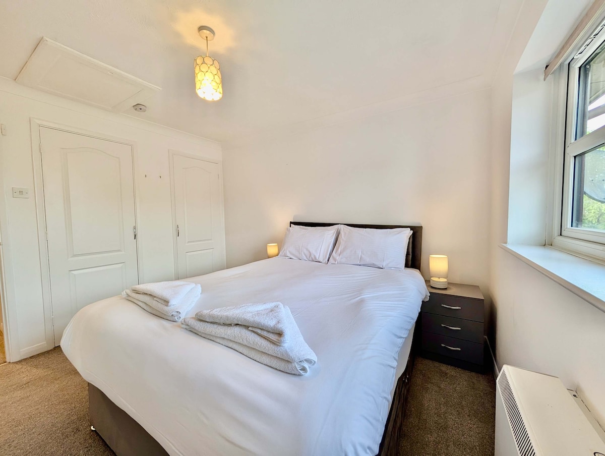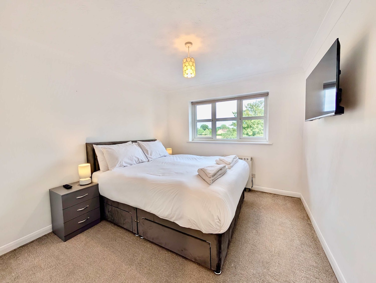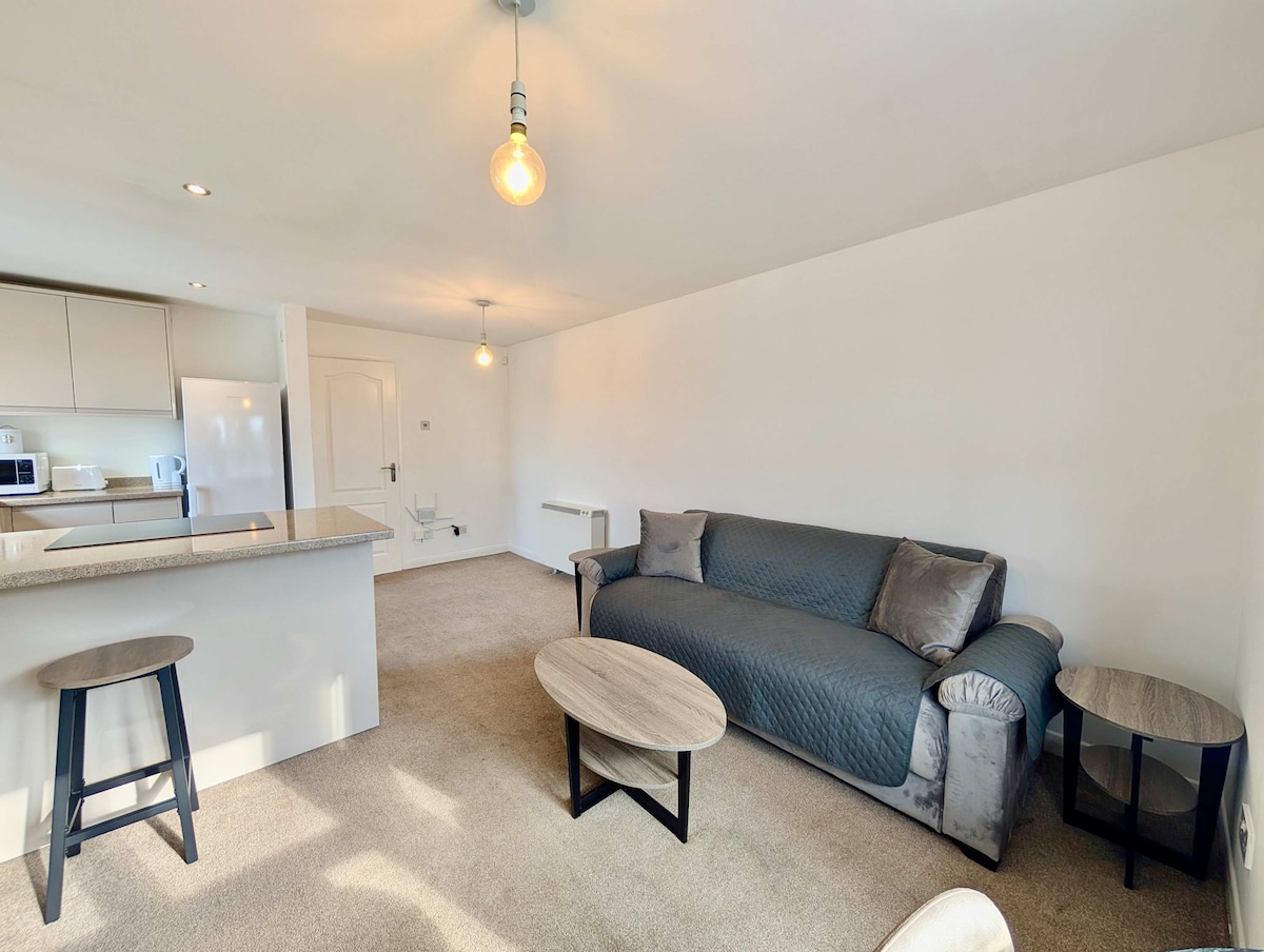 This stylish one-bedroom flat in Slough offers a comfortable and modern living experience, ideal for couples and small groups. The spacious living room features a large, comfy sofa and a big flat-screen TV, perfect for cozy nights in, while the elegant round dining table by the window provides a lovely spot to enjoy meals with views of the neighbourhood. The open-plan kitchen is fully equipped with all the modern appliances and tools you need to create your favourite dishes, and there's even a welcoming bar area—perfect for sipping a cold drink on warm summer days. The generously sized bedroom boasts a luxurious king-sized bed, offering the perfect space to unwind and recharge after a busy day.Location Highlight: