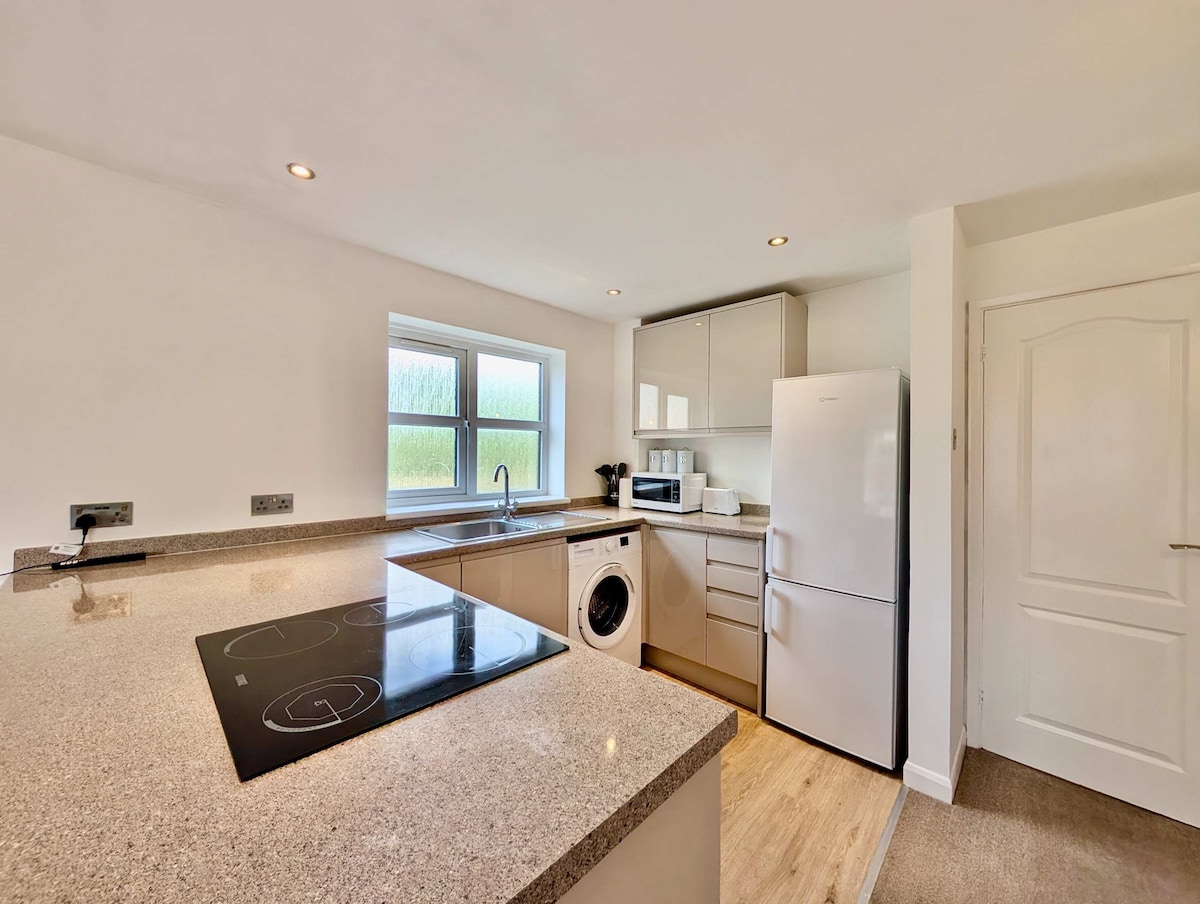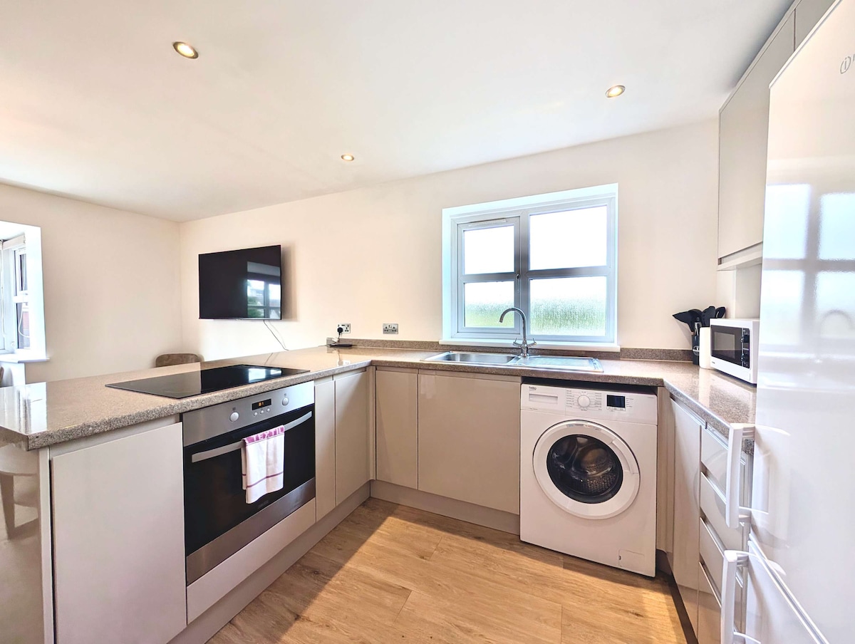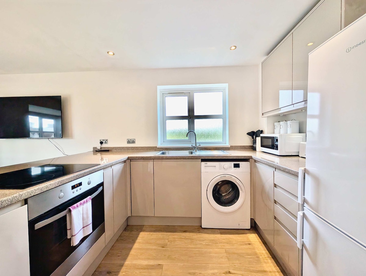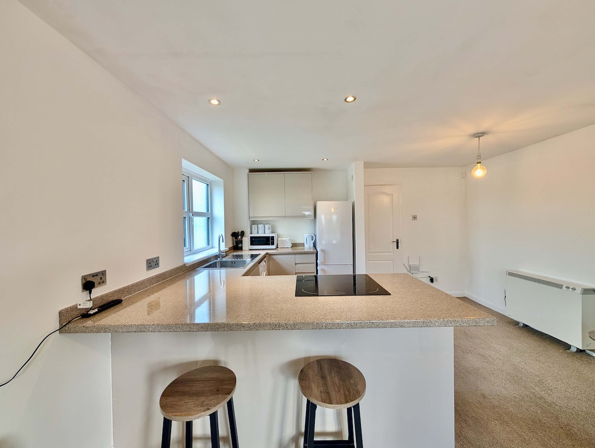 This stylish one-bedroom flat in Slough offers a comfortable and modern living experience, ideal for couples and small groups. The spacious living room features a large, comfy sofa and a big flat-screen TV, perfect for cozy nights in, while the elegant round dining table by the window provides a lovely spot to enjoy meals with views of the neighbourhood. The open-plan kitchen is fully equipped with all the modern appliances and tools you need to create your favourite dishes, and there's even a welcoming bar area—perfect for sipping a cold drink on warm summer days. The generously sized bedroom boasts a luxurious king-sized bed, offering the perfect space to unwind and recharge after a busy day.Location Highlight: