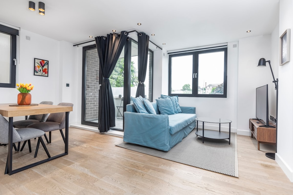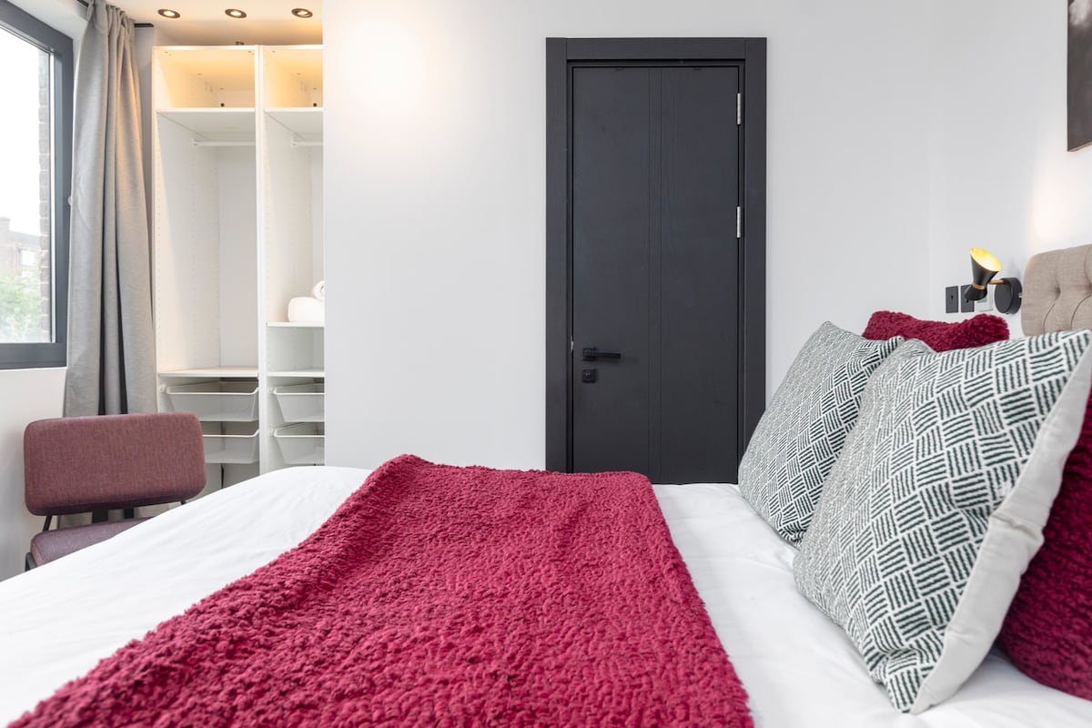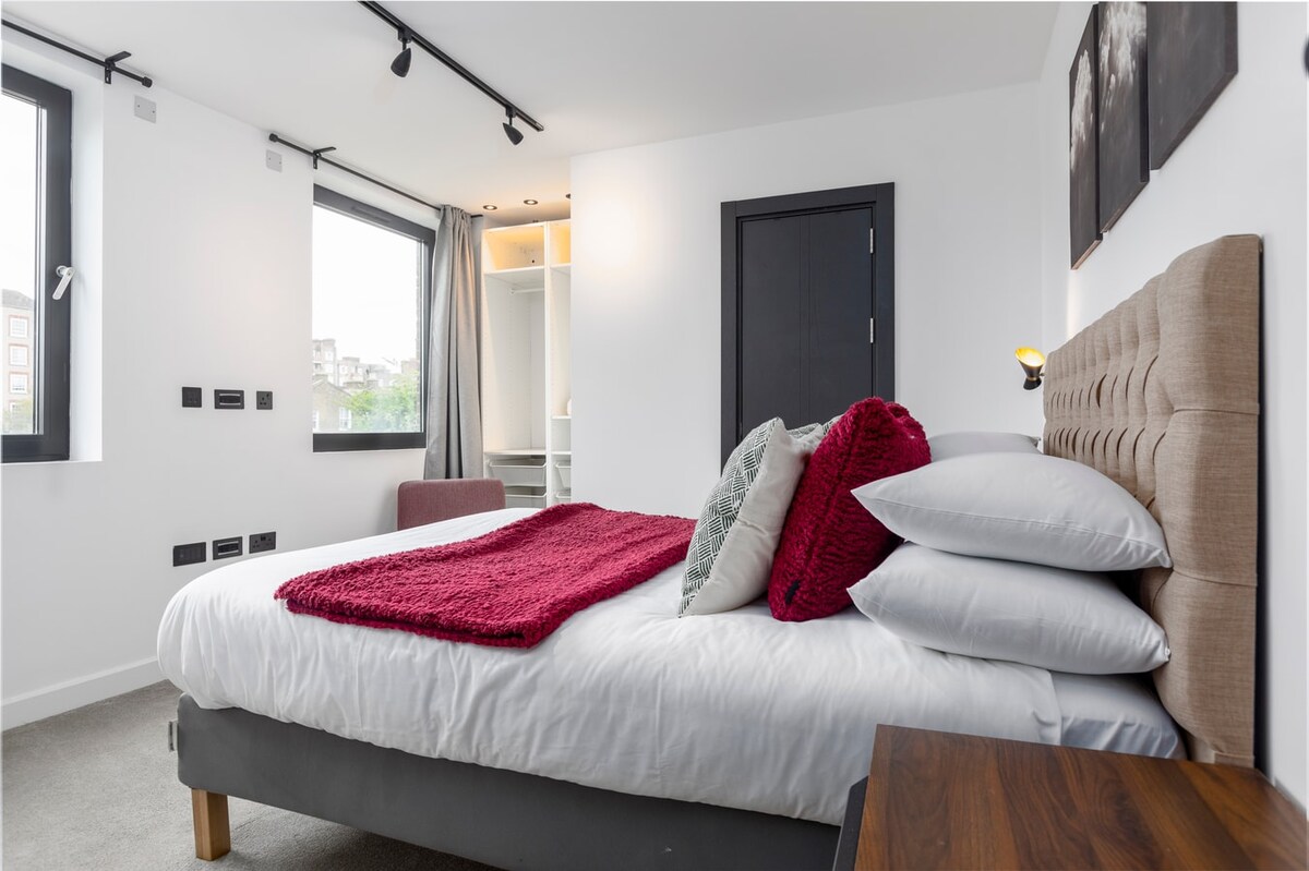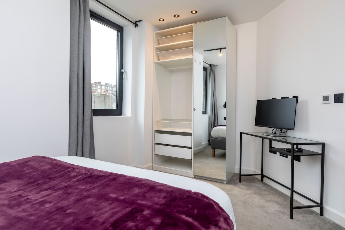 This spacious, modern 2-bedroom apt features 2 bathrooms, an open plan kitchen, and a living room with a balcony. It is 5 minutes from Kentish Town tube station on a peaceful road. The apartment entrance is on the 2nd floor, accessible via lift; the flat has amenities like a Nespresso machine, dishwasher, and washer/dryer. The living area has a sofa, dining table, chairs and a Smart TV. The beds' size are King (190 x 150 cm) and Double (190 x 135 cm). Fast fibre WiFi is throughout.