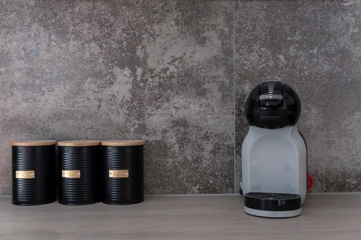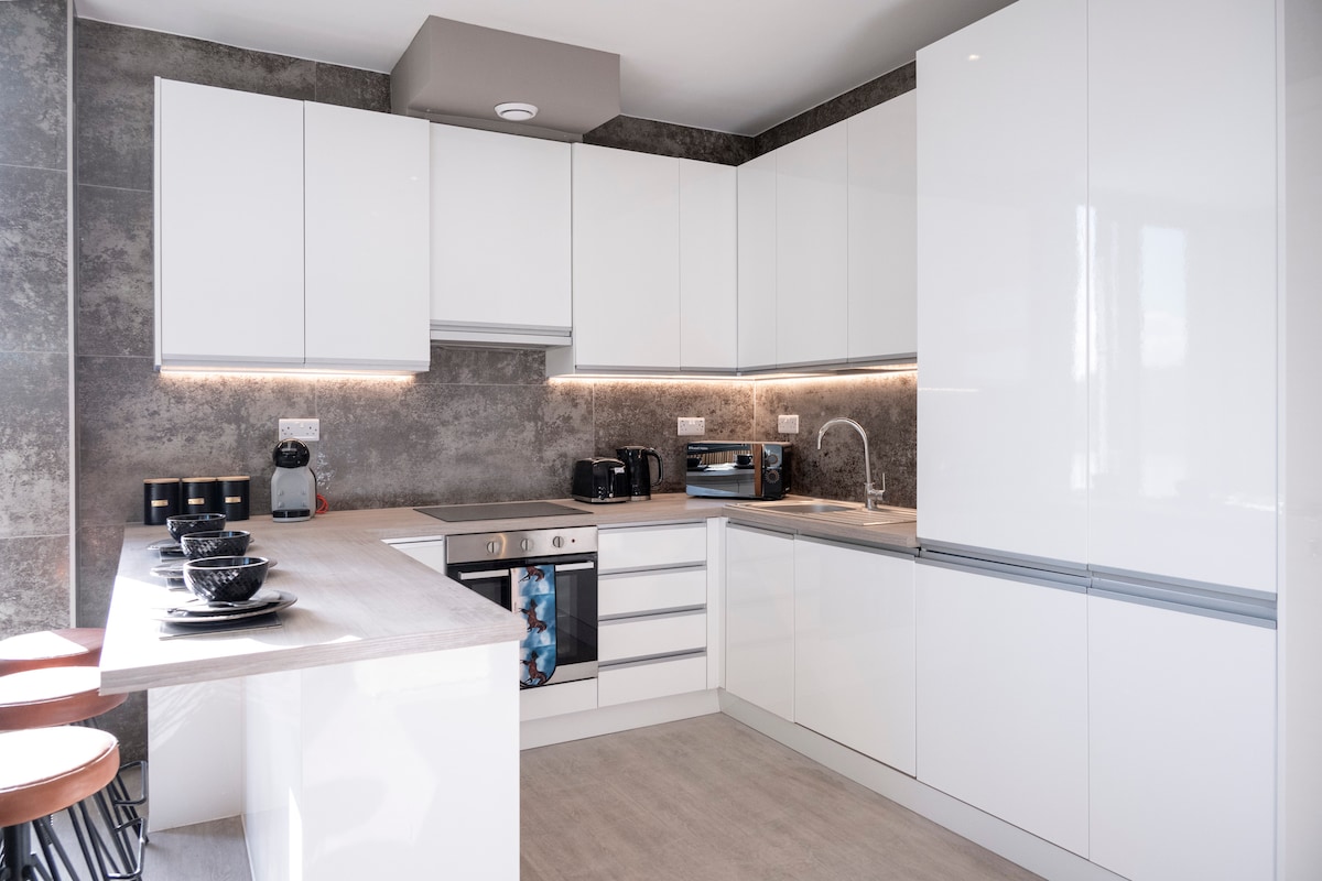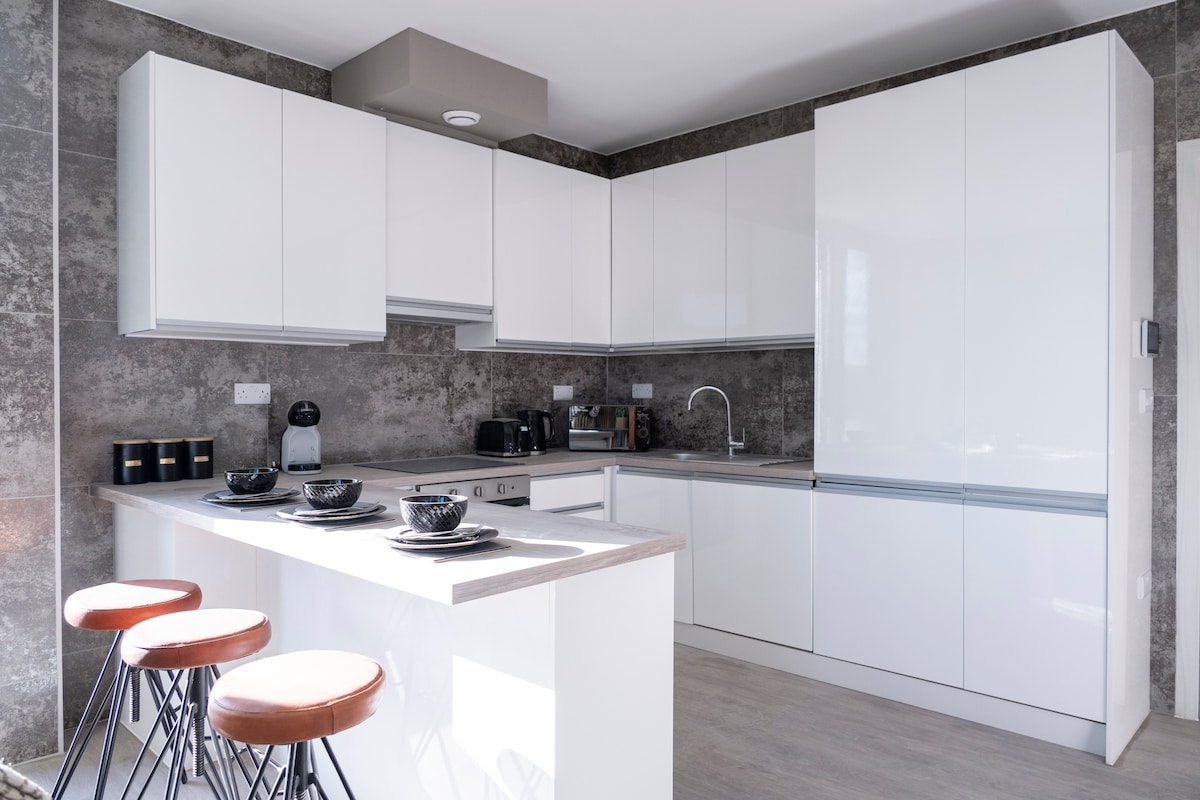 - Fully equipped kitchen with induction hob, oven, fridge, freezer, kettle, toaster, microwave, dishwasher, and coffee machine.