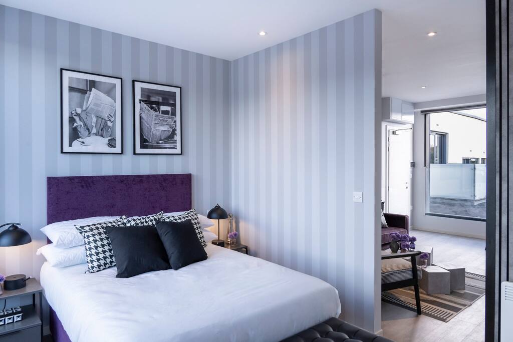 - Comfortable bedroom area with a small double bed (135 x 190 cm), two bedside tables and lamps.