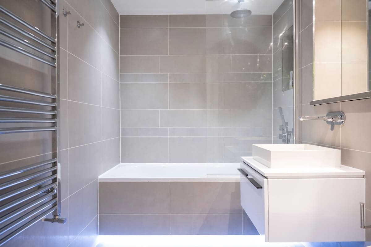 - The bathroom adjacent to the laundry area features a shower over the bathtub.