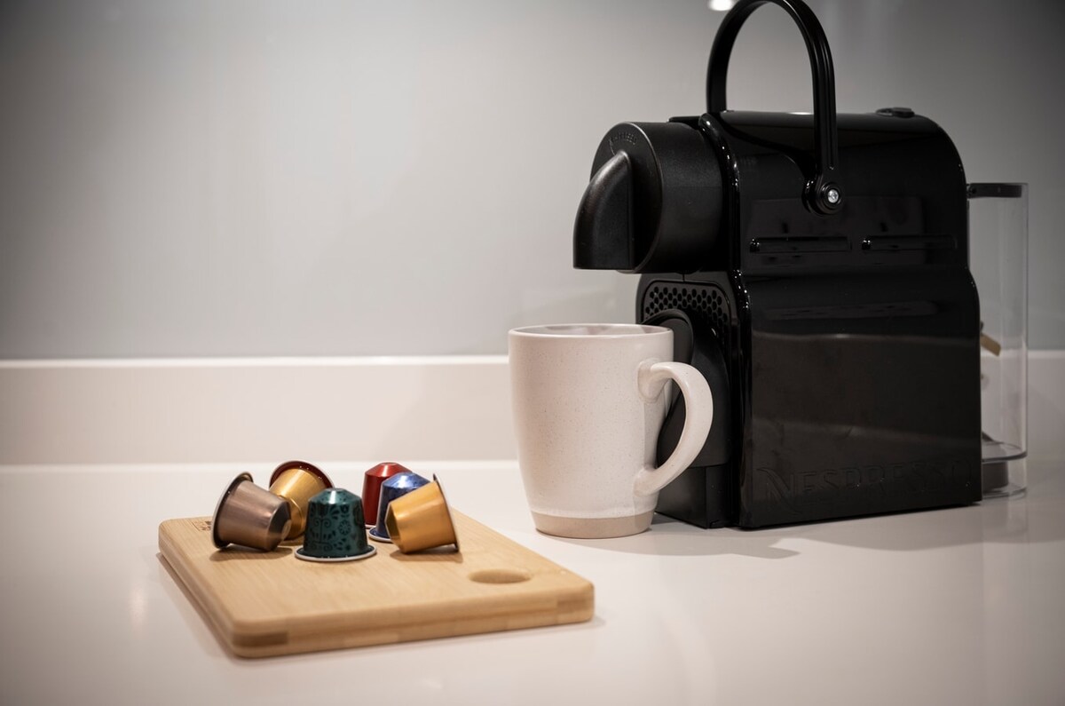 The fully equipped kitchen has a six-seater table, ideal for meals or productive meetings.