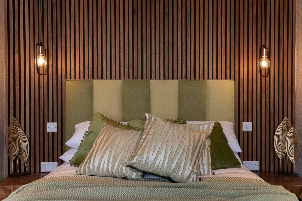 - Comfortable bedroom with a double bed, two bedside tables, lamps, and storage space.