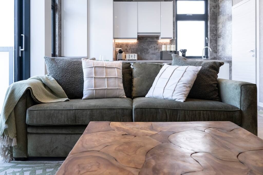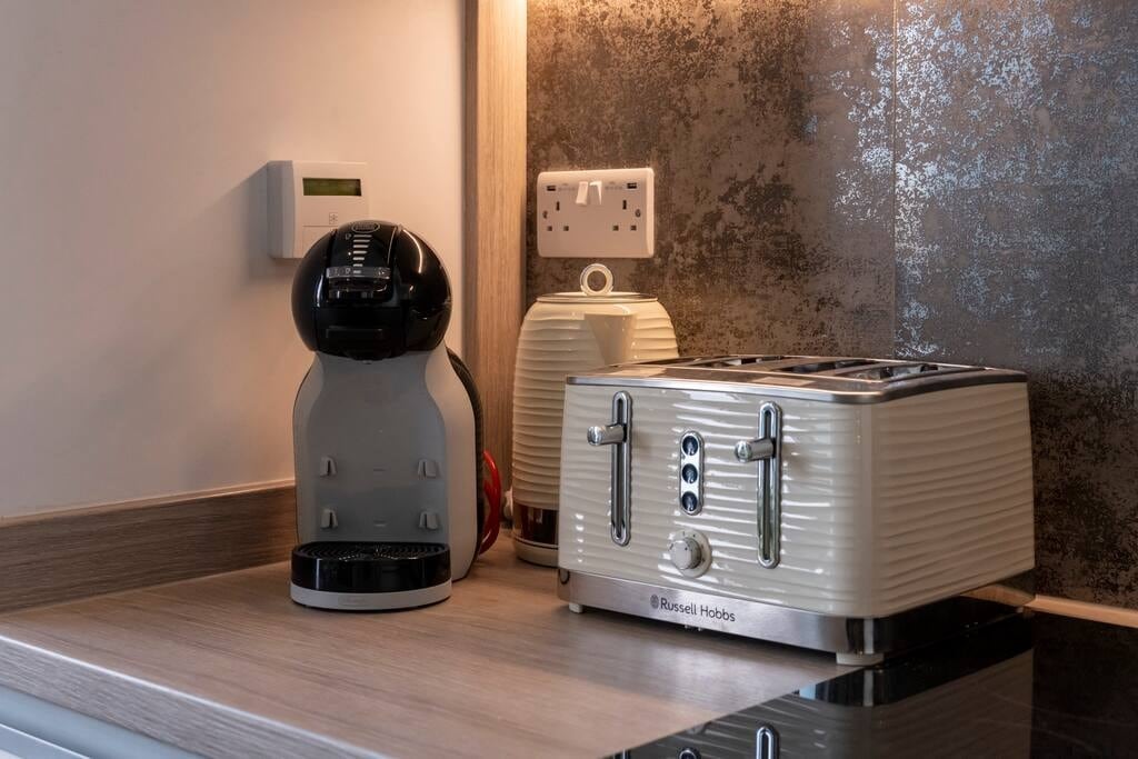 - Fully equipped kitchen with induction hob, oven, fridge, freezer, kettle, toaster, microwave, dishwasher, and coffee machine.
