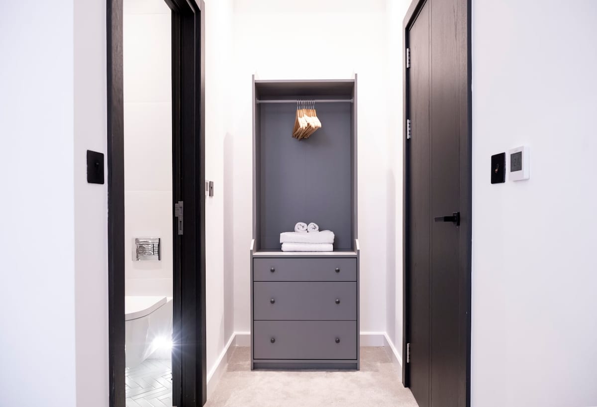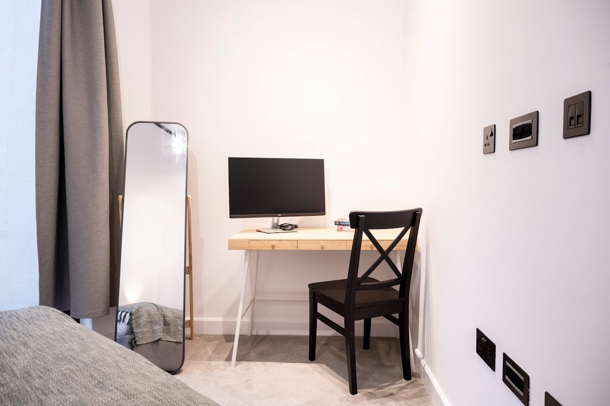 - Features a King-size bed (200cm x 150cm), a wardrobe, a desk with a 27-inch monitor, and bedside lamps.