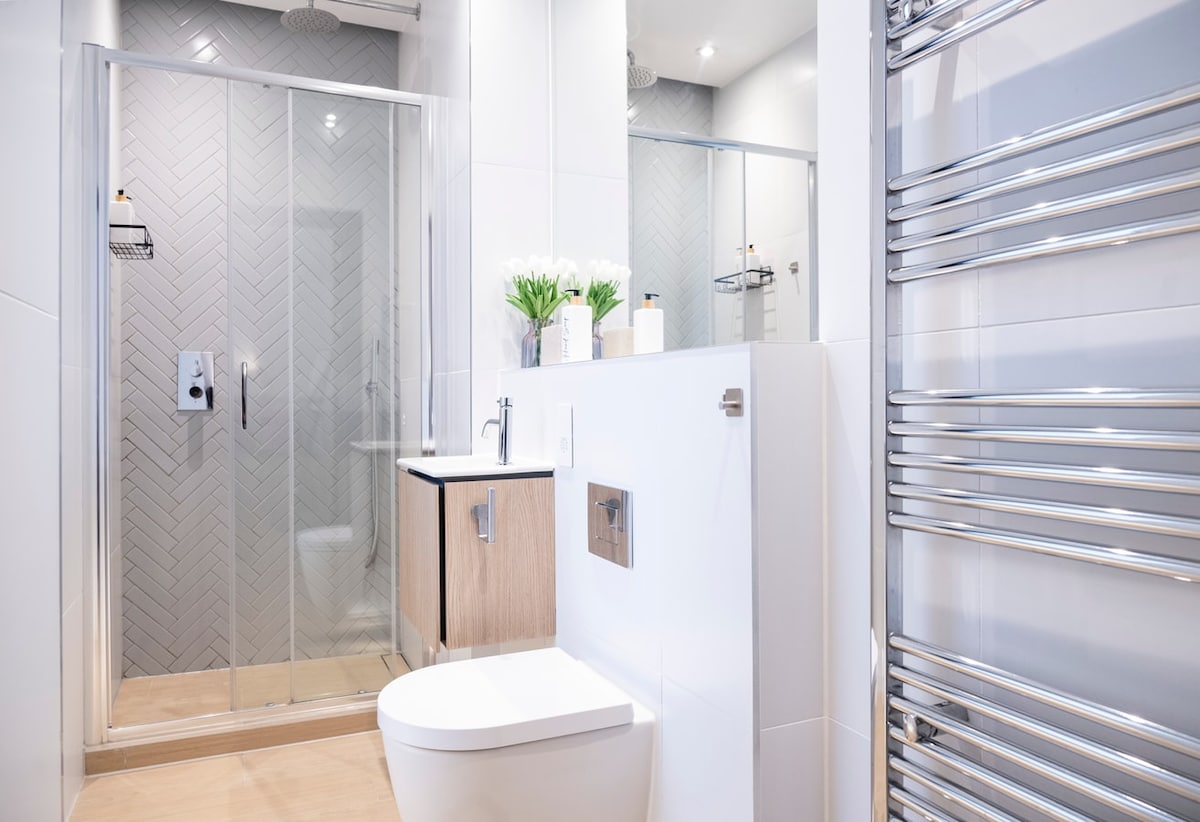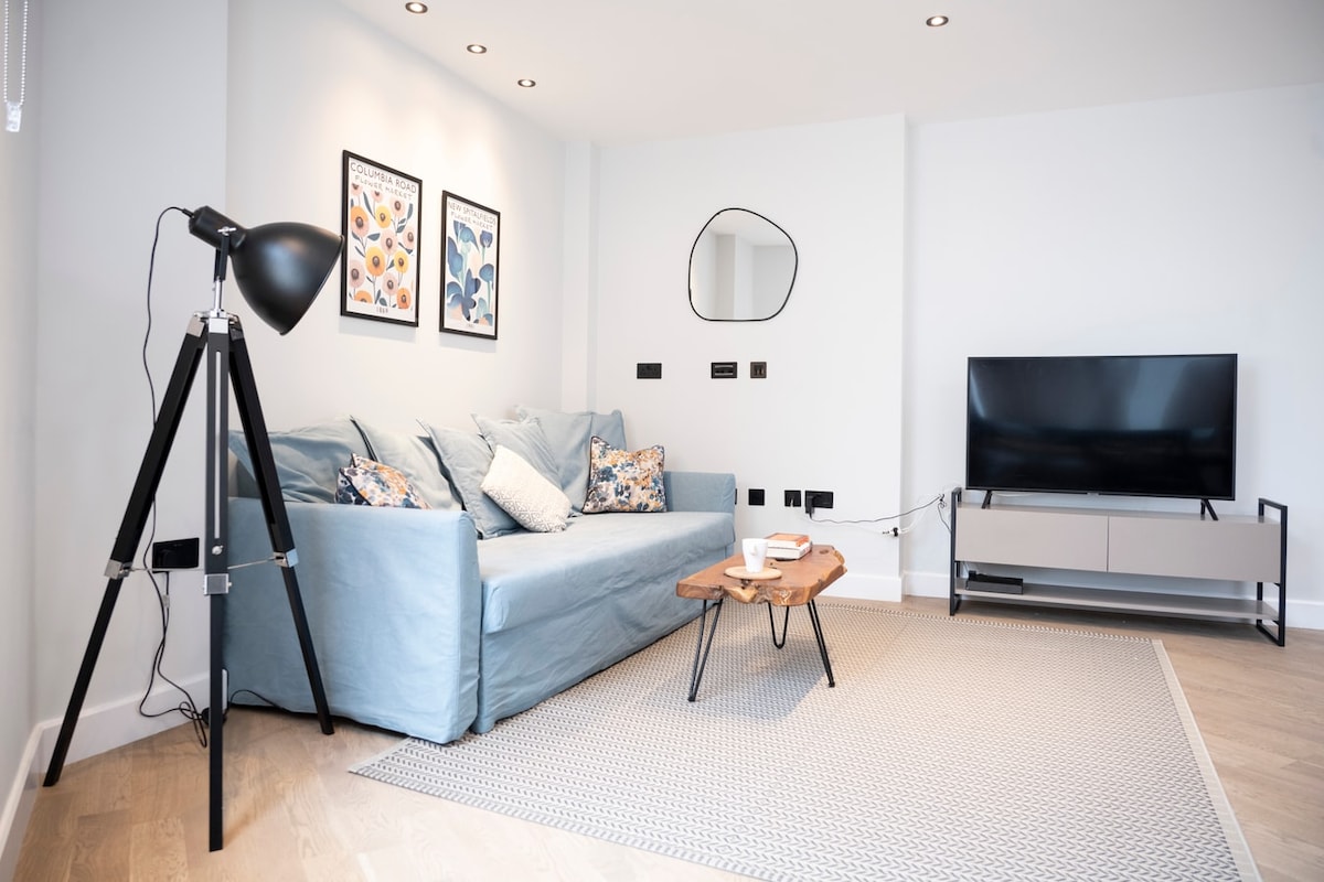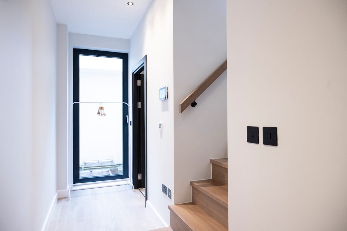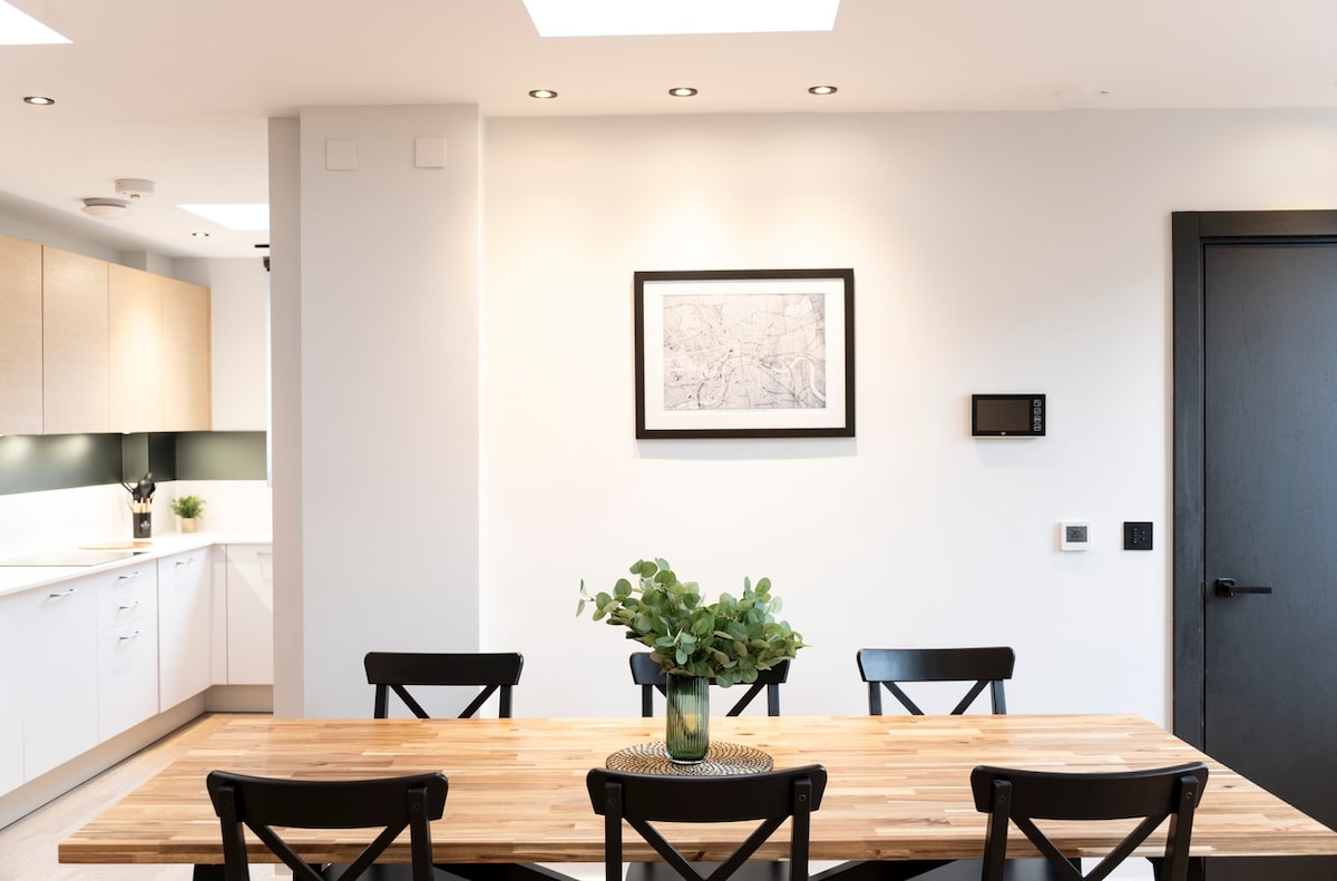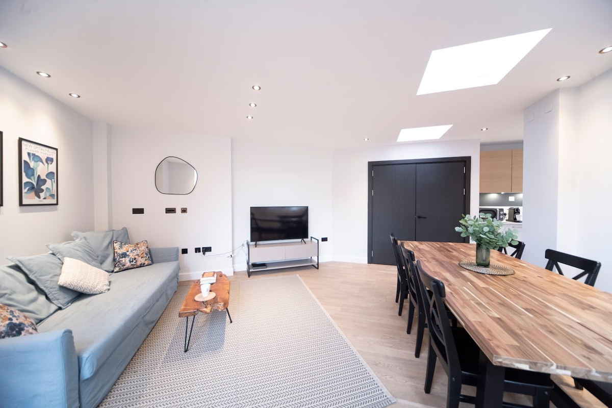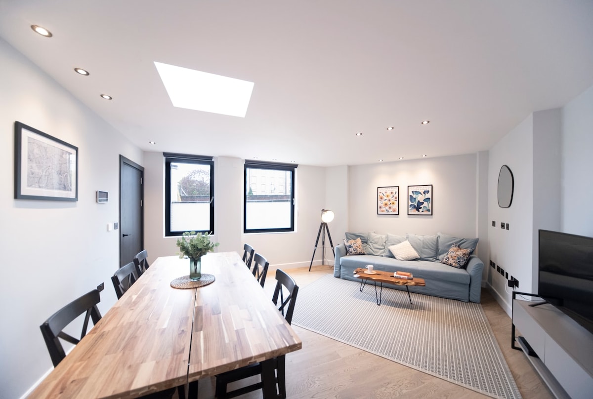 This spacious, modern 2-bedroom apartment features 2.5 bathrooms and an open-plan kitchen and living room. It is located on a peaceful road 5 minutes from Kentish Town tube station. The apartment entrance is on the ground floor, and the 2 bedrooms are on the lower ground floor. The flat has amenities like a Nespresso machine, dishwasher, and washer/dryer. The living area has a sofa, dining table, chairs, and a Smart TV. Fibre WiFi is available throughout.